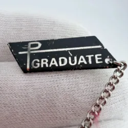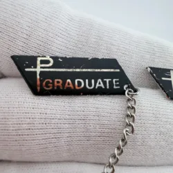 This set includes two pins with a black background and silver tone highlights. Each pin displays the word “Graduate” and includes a small attached chain with the number “72.”