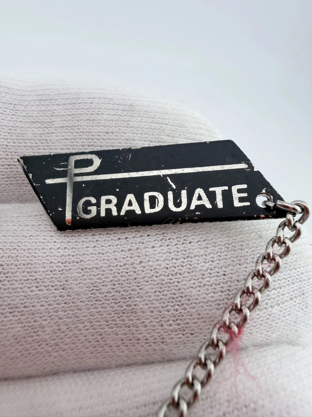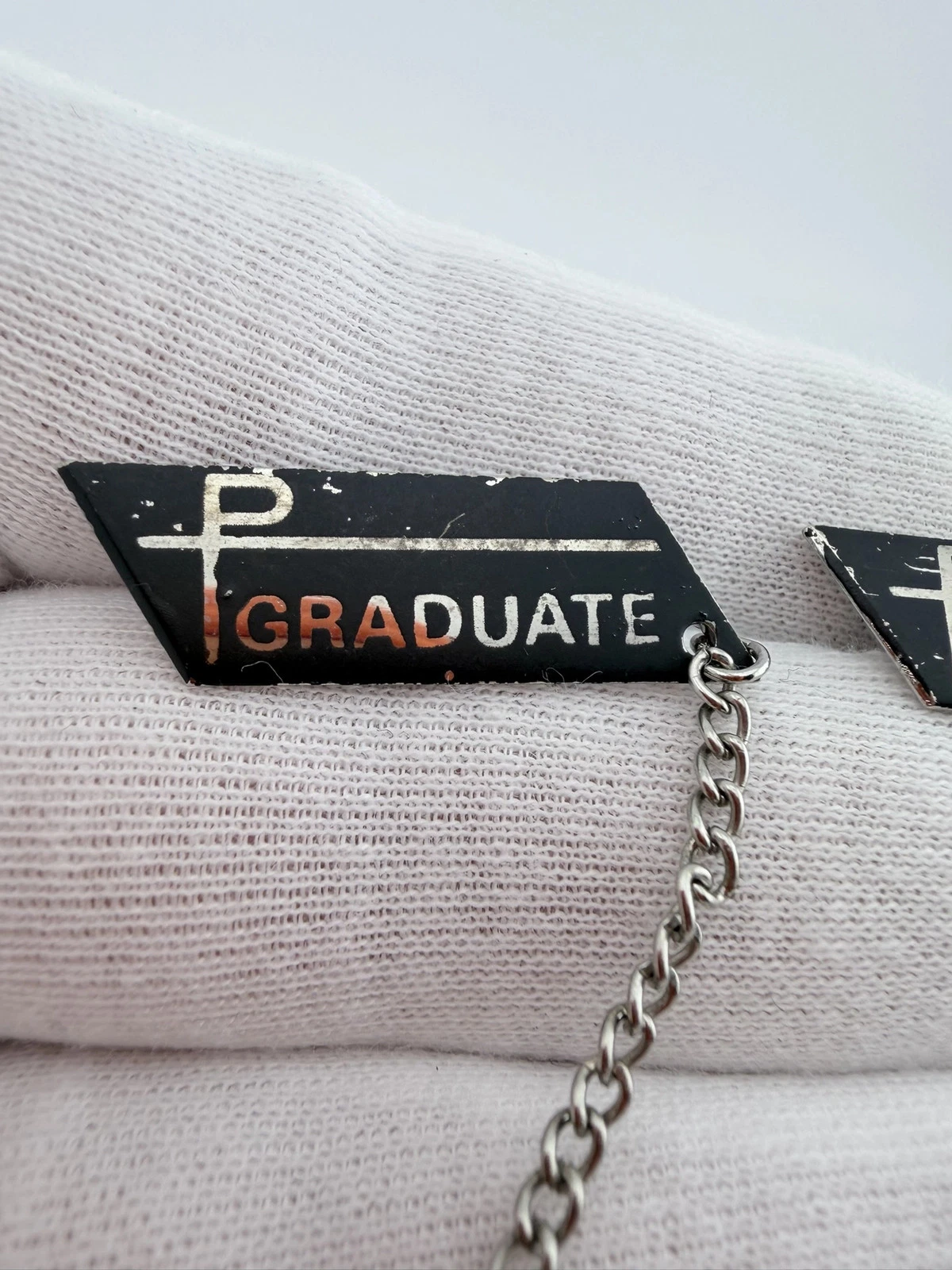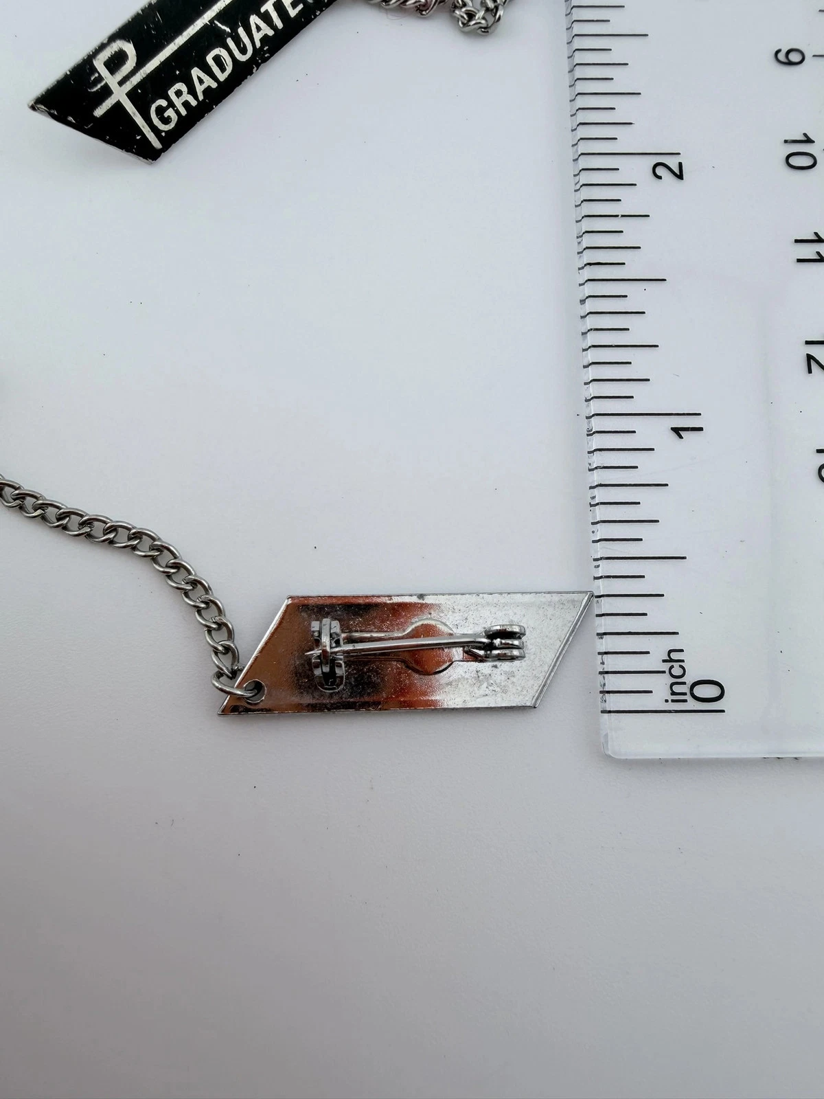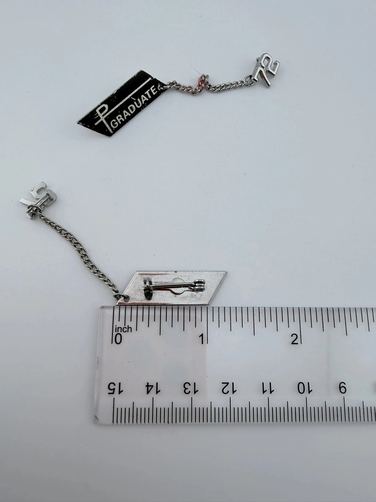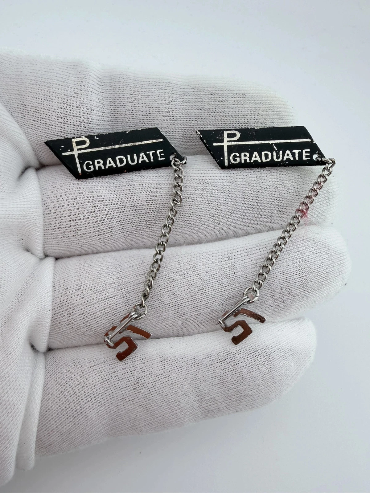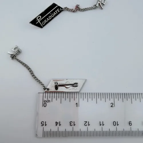 This set includes two pins with a black background and silver tone highlights. Each pin displays the word “Graduate” and includes a small attached chain with the number “72.”