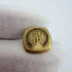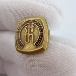 This pin features the text “St John’s Hospital Volunteer Service” over a deep red enamel background. At the center is an older style logo with the letters “S” and “JH,” where the letters “J” and “H” share a vertical stem, along with a small cross.