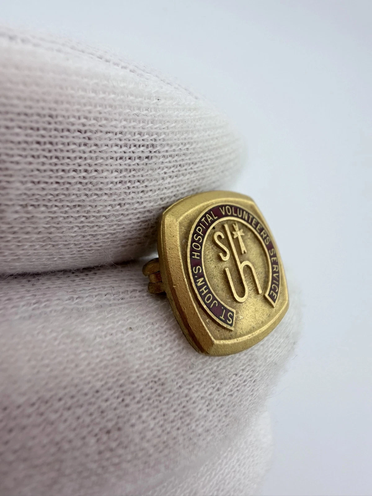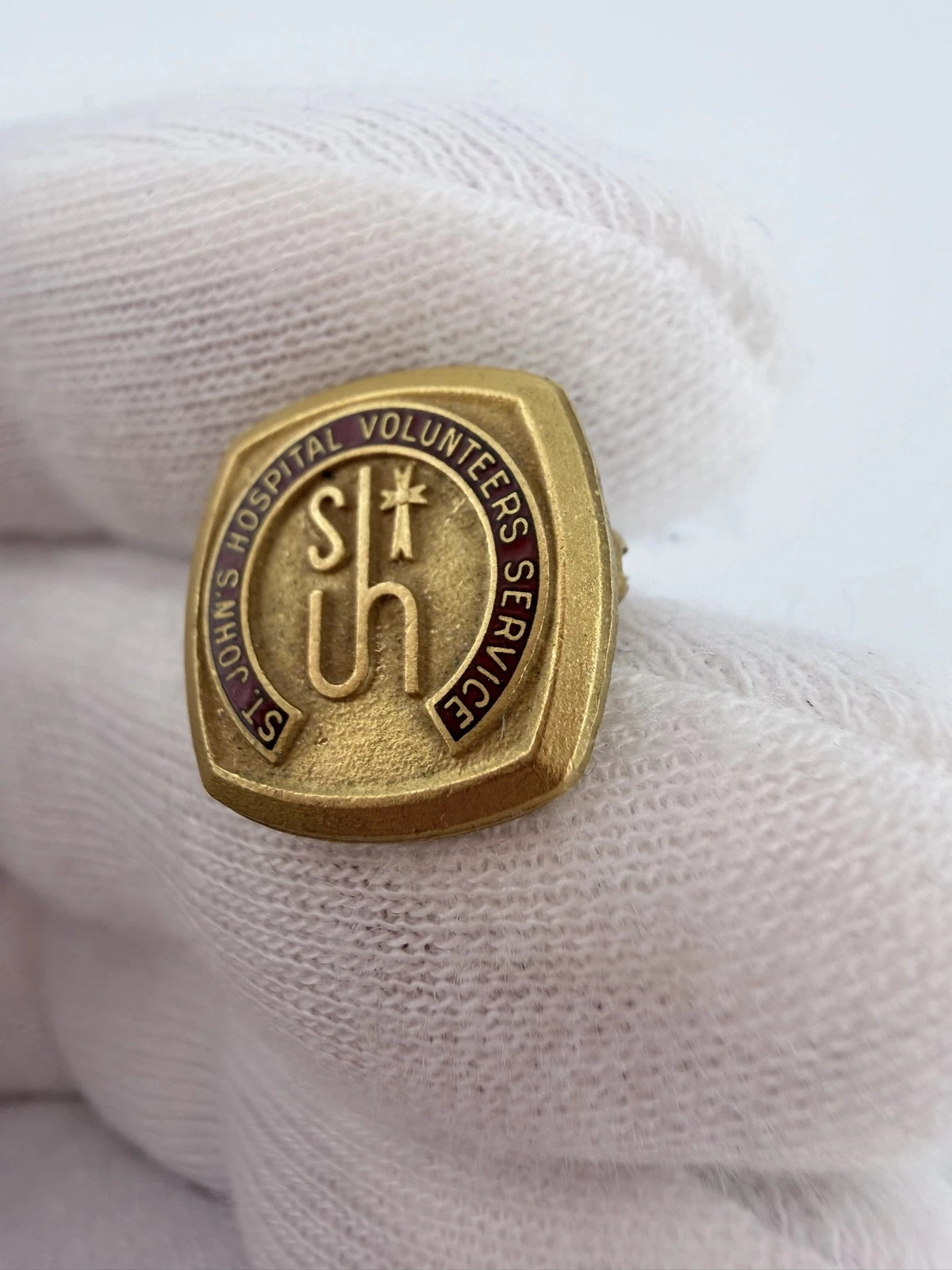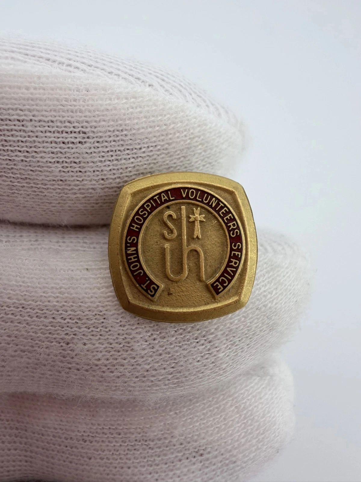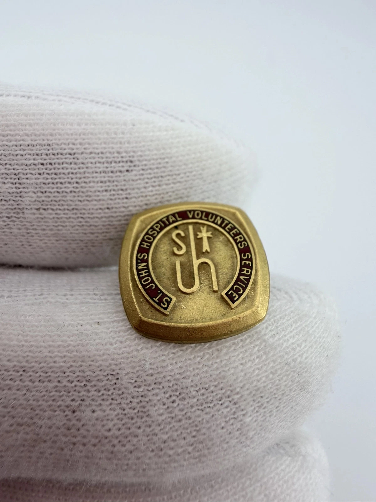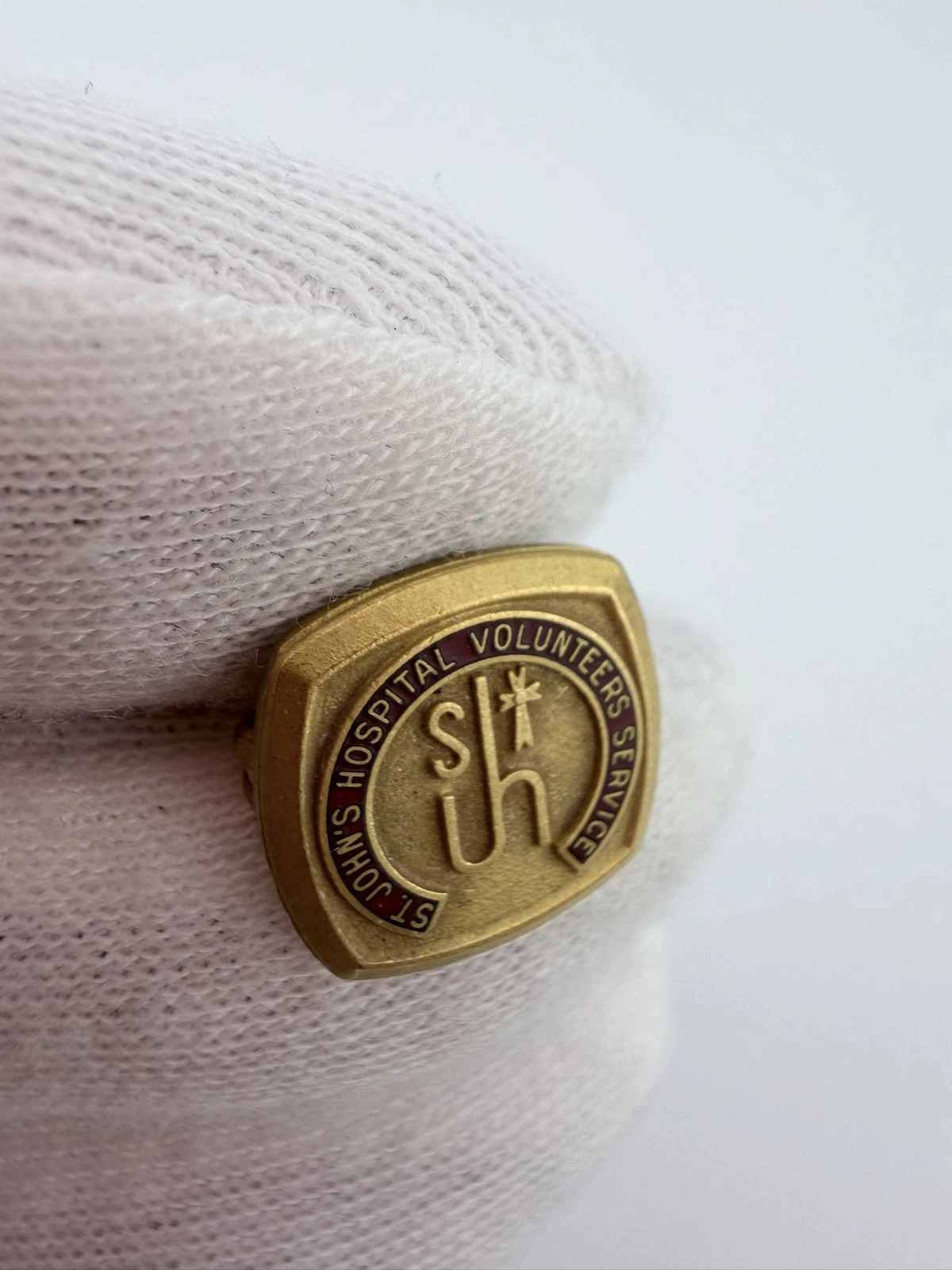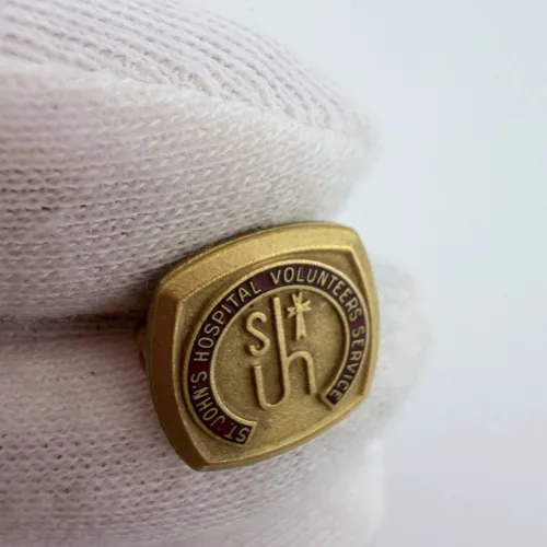 This pin features the text “St John’s Hospital Volunteer Service” over a deep red enamel background. At the center is an older style logo with the letters “S” and “JH,” where the letters “J” and “H” share a vertical stem, along with a small cross.