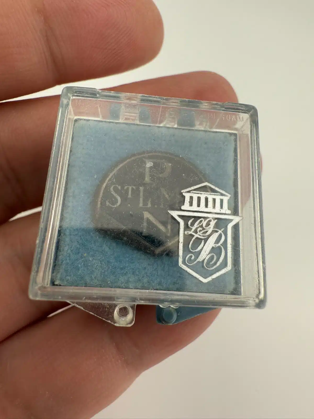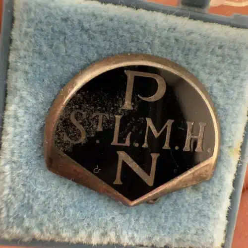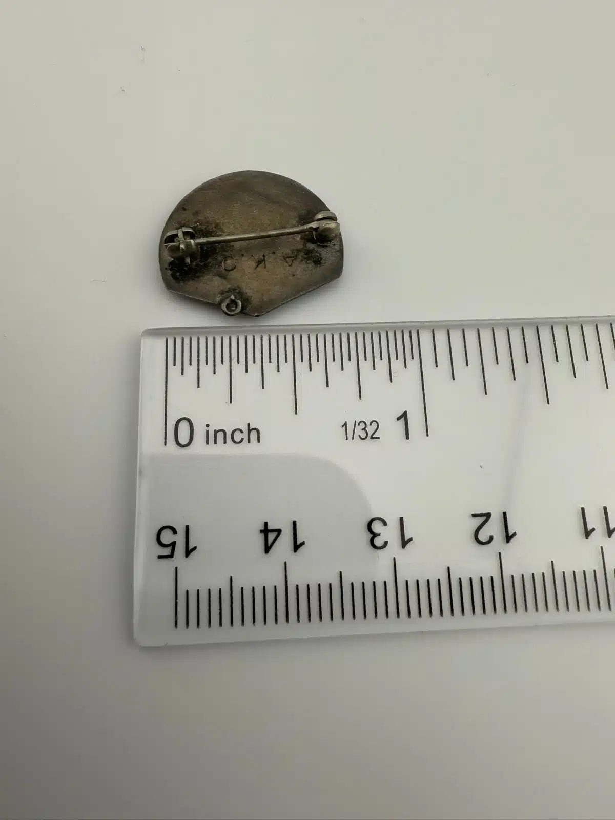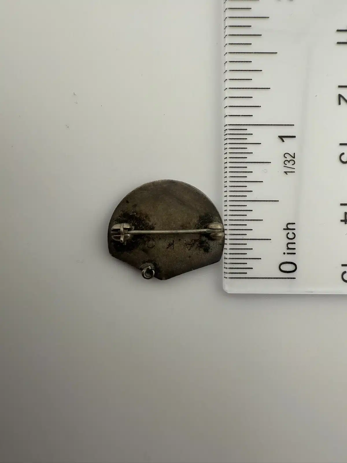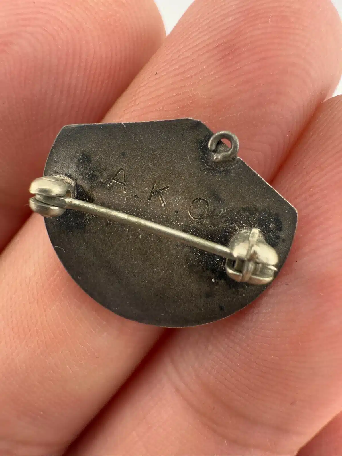 Used with marks including some form of corrosion or flaw on the left side of the pin. Pin does not have a LGBalfour hallmark, so possibly an unrelated case. Initialed AKO on rear.