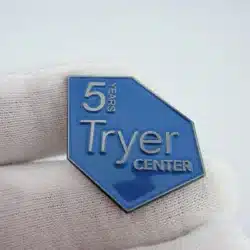 Starbucks Tryer Center 5 Years pin features an asymmetrical geometric design with a blue enamel background and silver tone highlights. The upper left corner reads “5 Years,” with “Tryer Center” displayed below, referencing Starbucks’ internal innovation facility where new products, store concepts, and design ideas are developed and tested. Unsure if this is an employee service pin or a 5-year anniversary pin for the Tryer Center.