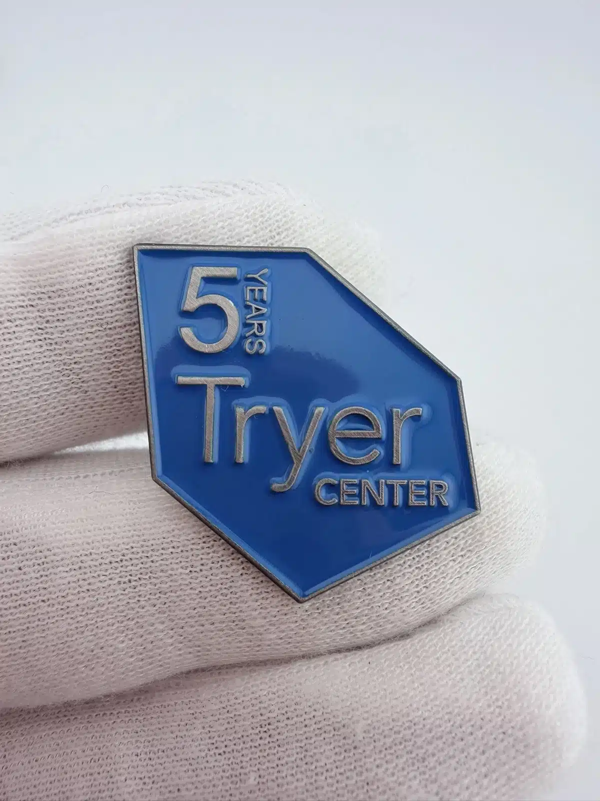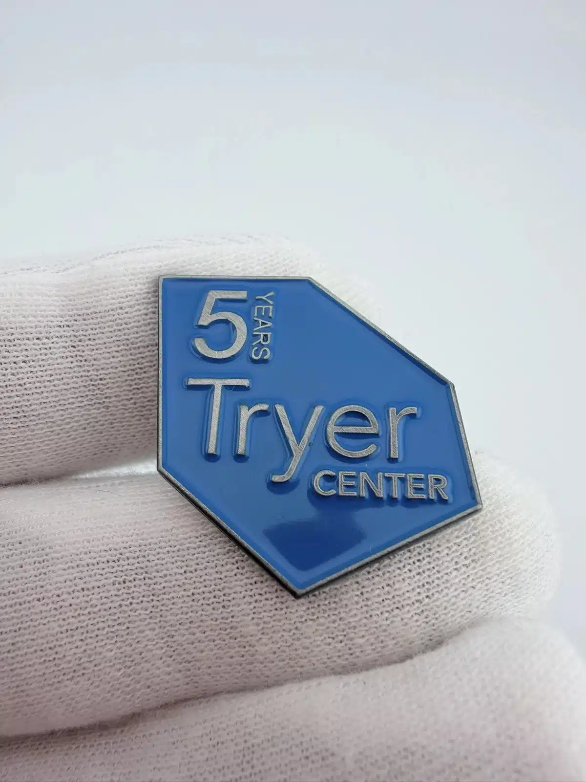 Starbucks Tryer Center 5 Years pin features an asymmetrical geometric design with a blue enamel background and silver tone highlights. The upper left corner reads “5 Years,” with “Tryer Center” displayed below, referencing Starbucks’ internal innovation facility where new products, store concepts, and design ideas are developed and tested. Unsure if this is an employee service pin or a 5-year anniversary pin for the Tryer Center.