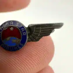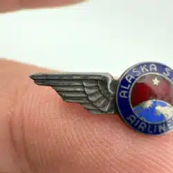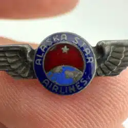 A truly beautiful and exceptionally rare piece of Alaska Airlines history. The “Alaska Star Airlines” name was used between 1942 and 1944, before the company officially became Alaska Airlines. This sterling silver pin is in remarkable condition considering it is now over 80 years old. Pin has not been cleaned / polished / etc. Clasp is tested and functional.
