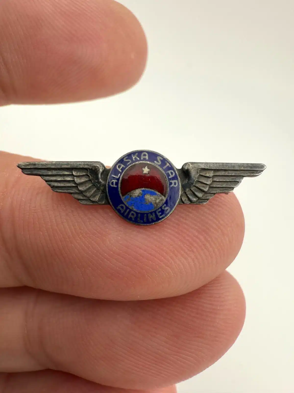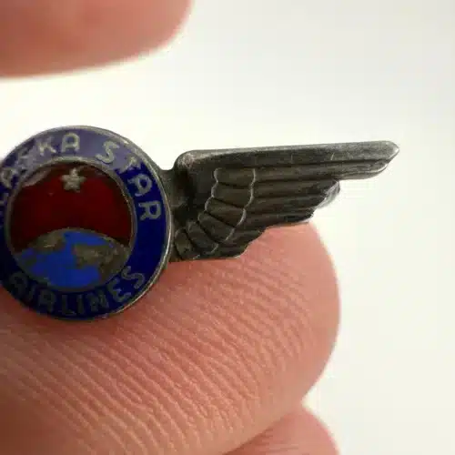 A truly beautiful and exceptionally rare piece of Alaska Airlines history. The “Alaska Star Airlines” name was used between 1942 and 1944, before the company officially became Alaska Airlines. This sterling silver pin is in remarkable condition considering it is now over 80 years old. Pin has not been cleaned / polished / etc. Clasp is tested and functional.