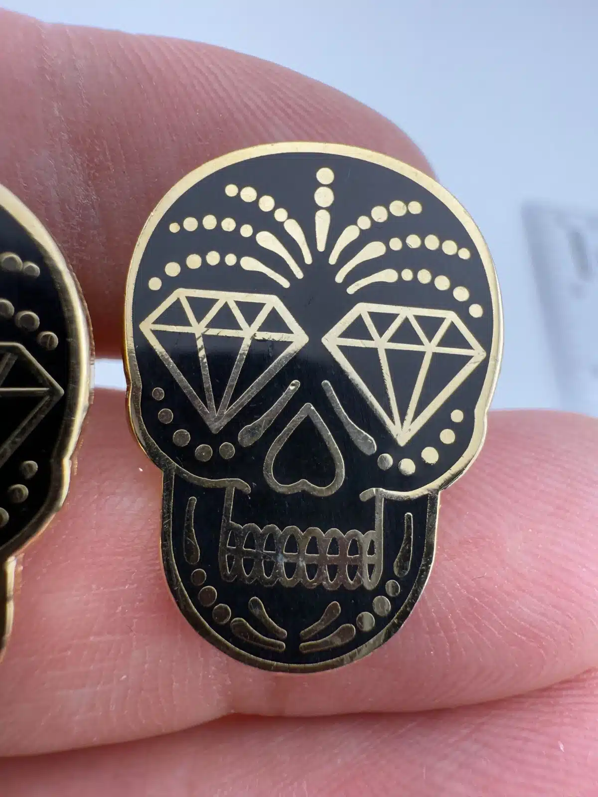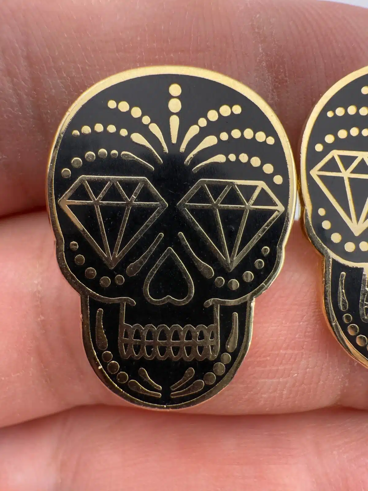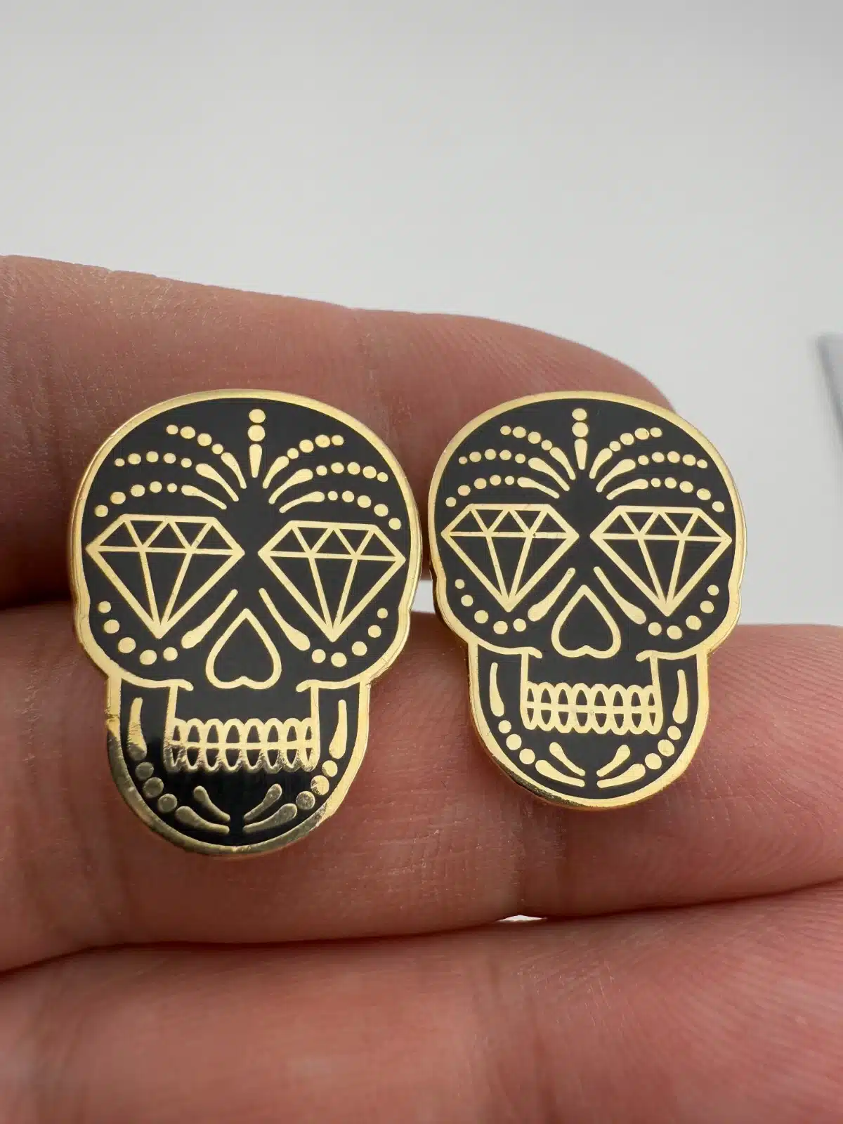 Sugar Skull with Diamond Eyes Gold Tone on Black Pins