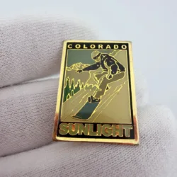 This pin features a vertically oriented design with a snowboarder riding down a mountain at the center. Trees and another mountain appear in the background, with “Colorado” at the top and “Sunlight” at the bottom.