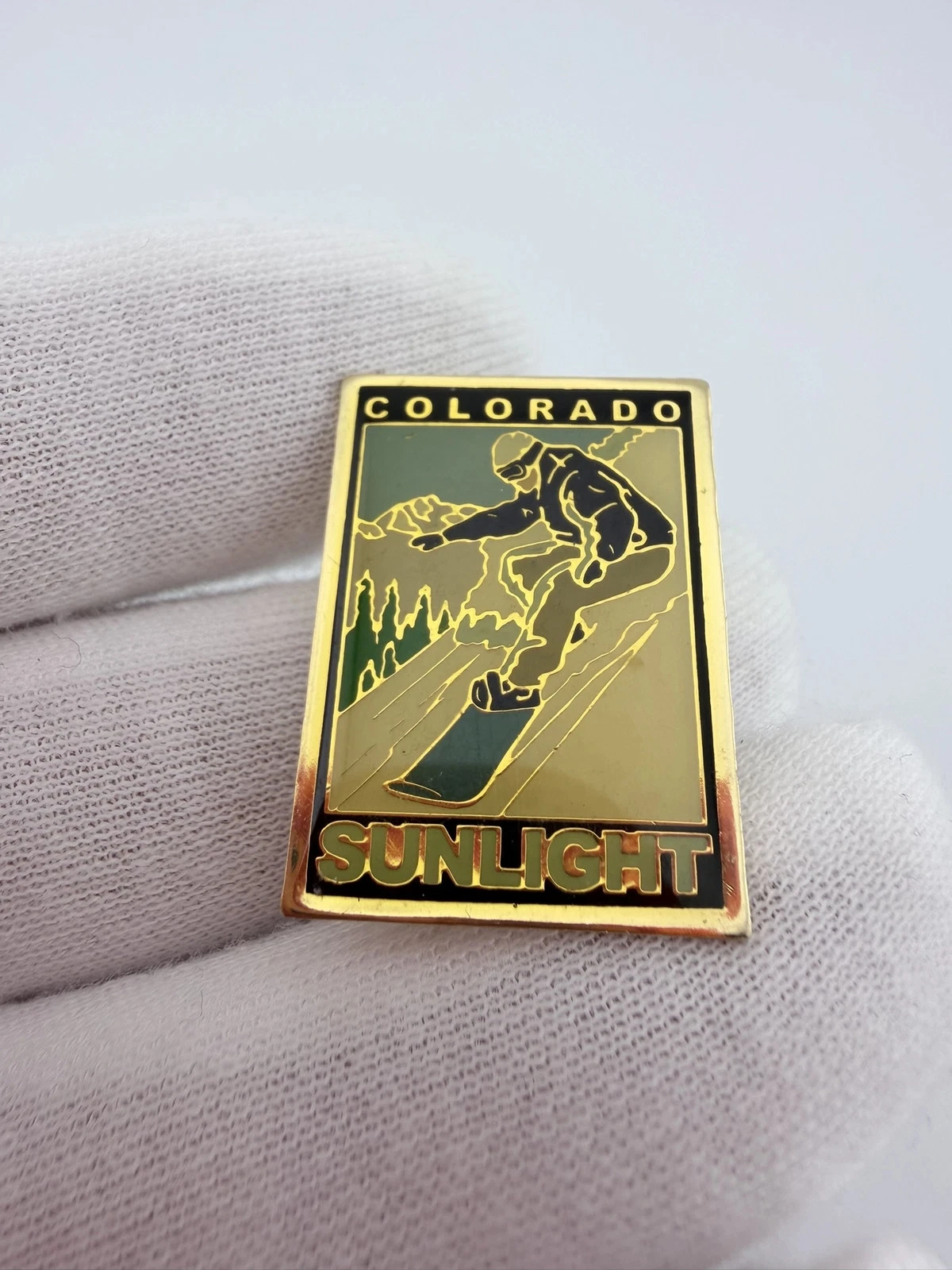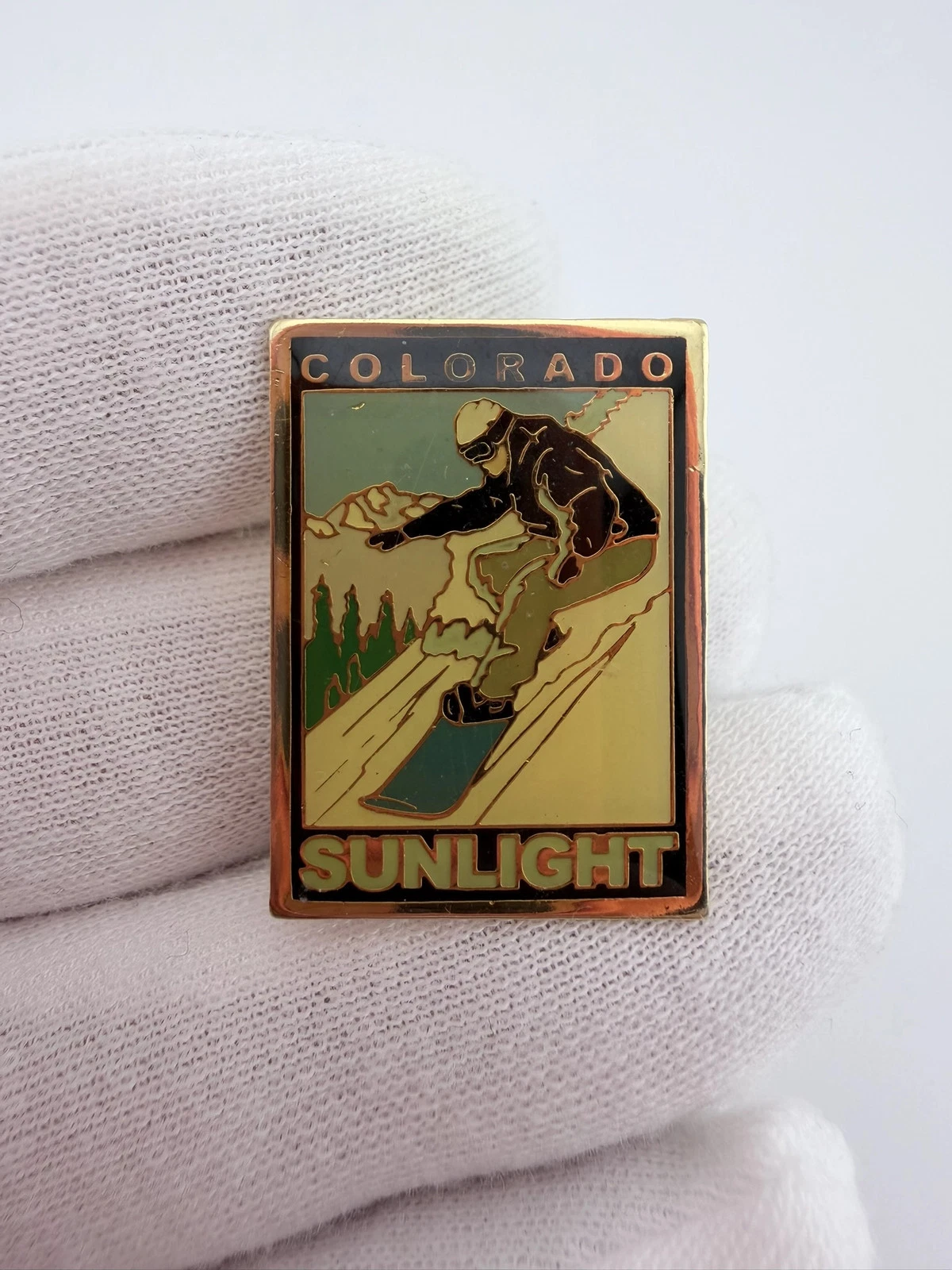 This pin features a vertically oriented design with a snowboarder riding down a mountain at the center. Trees and another mountain appear in the background, with “Colorado” at the top and “Sunlight” at the bottom.