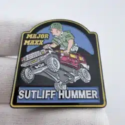 This pin showcases Major Maxx confidently driving atop a vibrant red H2 Hummer, with ‘SUTLIFF HUMMER’ prominently displayed at the bottom. The design reflects the adventurous spirit associated with the Hummer brand and its connection to Pennsylvania’s automotive culture.