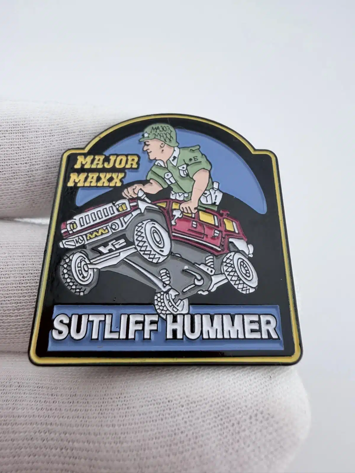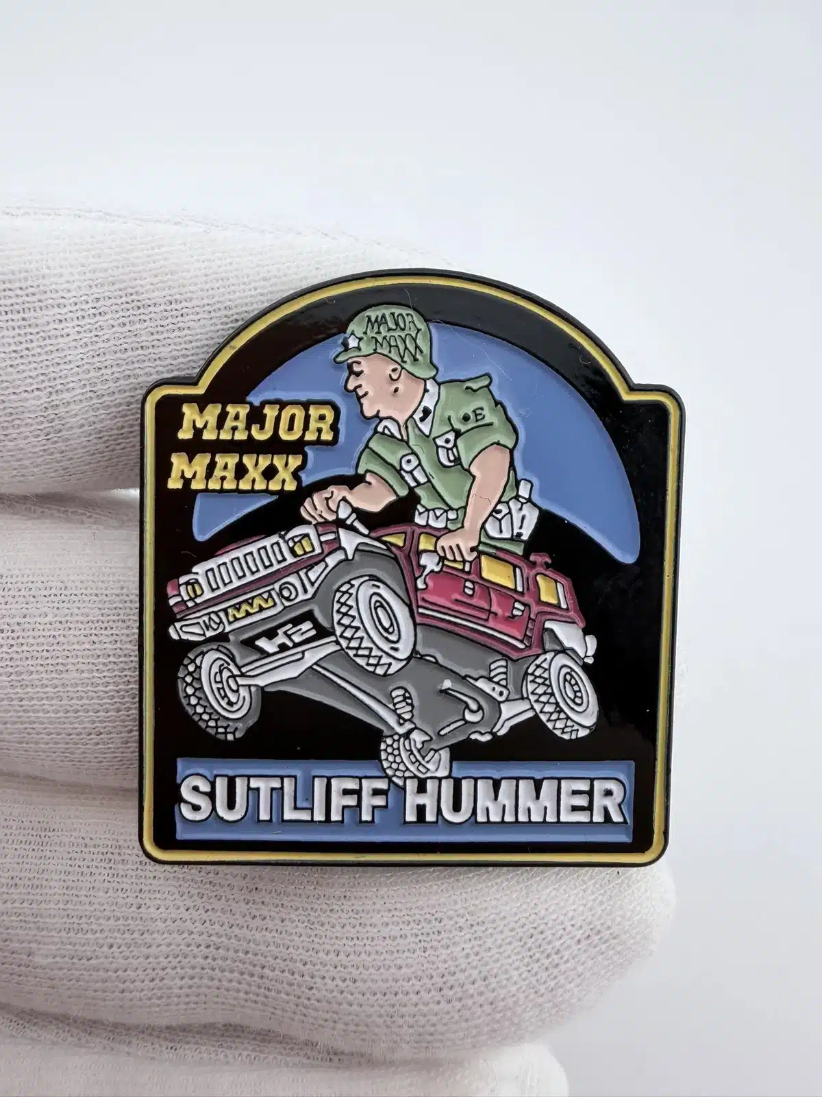 This pin showcases Major Maxx confidently driving atop a vibrant red H2 Hummer, with ‘SUTLIFF HUMMER’ prominently displayed at the bottom. The design reflects the adventurous spirit associated with the Hummer brand and its connection to Pennsylvania’s automotive culture.