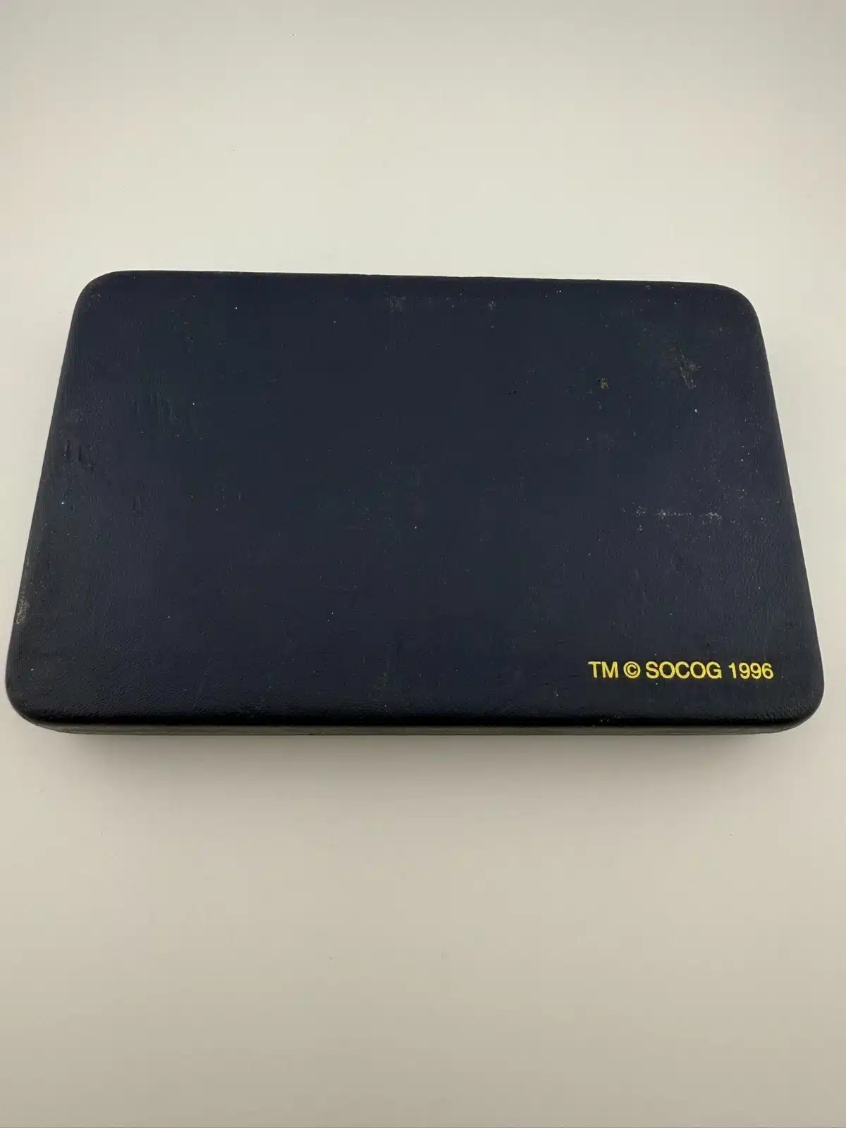 NOTE: Used with minor marks and manufacturing flaws. This pin set, and other copies of it, all have some form of color oddities / enamel flaws. Pin clasps are included. Box is not perfect, with dings and scratches.