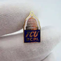 This pin features a capitol building and the letters TCU RCPL, which stands for the Transportation Communication Union Responsible Citizens’ Political League. The intricate details capture the essence of the league’s historical significance in promoting the interests of its members in political matters. The pin is 24K gold plated and manufactured by Bastian.