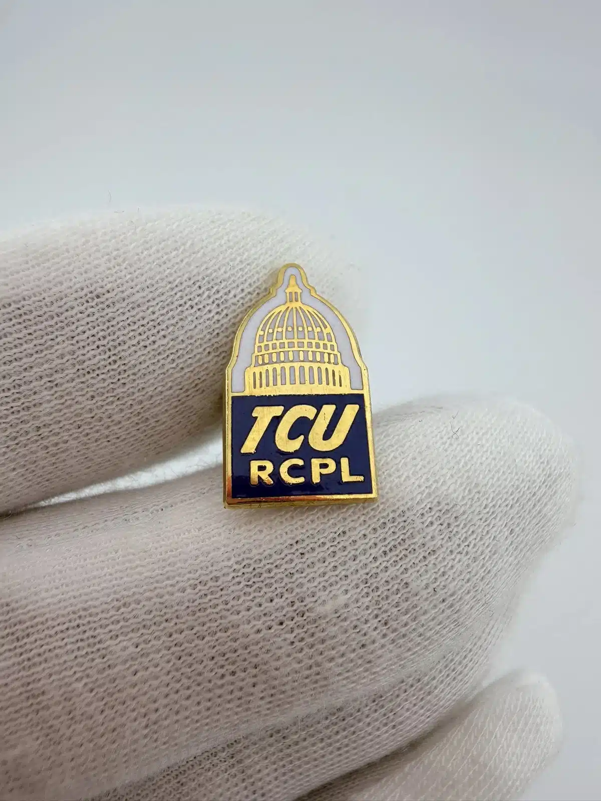This pin features a capitol building and the letters TCU RCPL, which stands for the Transportation Communication Union Responsible Citizens’ Political League. The intricate details capture the essence of the league’s historical significance in promoting the interests of its members in political matters. The pin is 24K gold plated and manufactured by Bastian.
