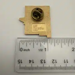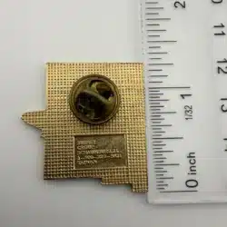 This pin is shaped like the state of New Mexico, showcasing a fun design that features an alien and a UFO crashing in the hills behind. The Telephone Pioneers of America New Mexico Chapter 117 is represented through this unique and playful depiction, reflecting the state’s rich association with extraterrestrial themes and its cultural significance in the realm of space exploration.