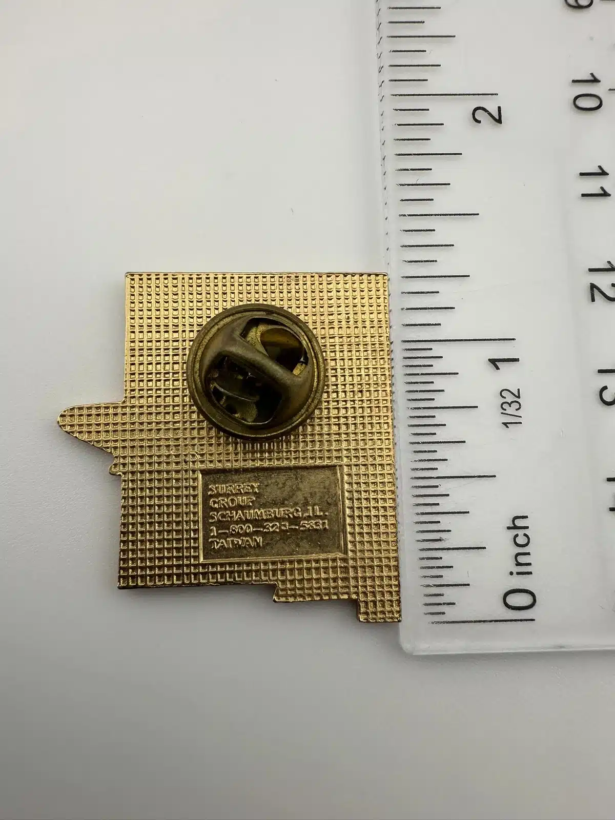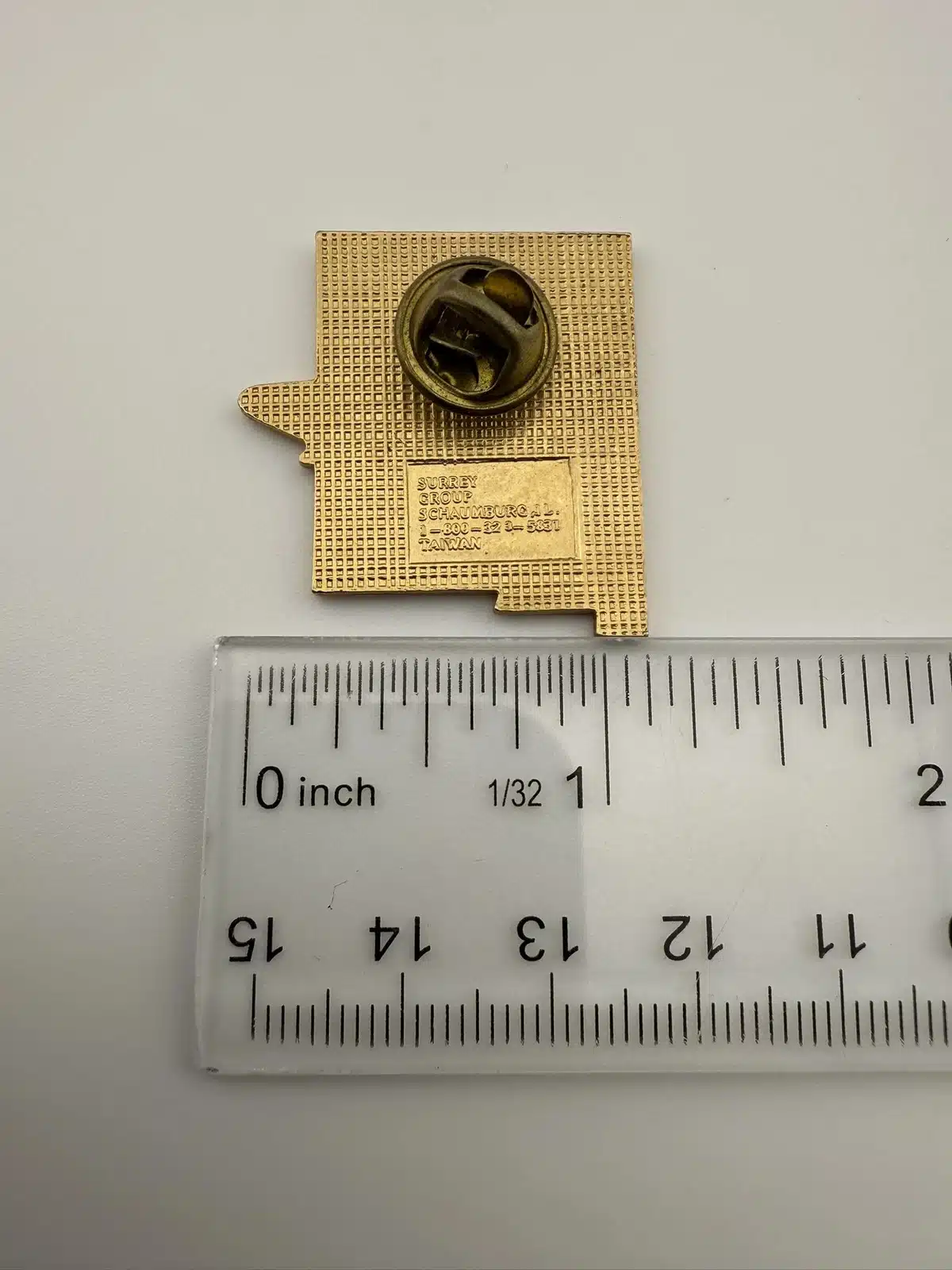 This pin is shaped like the state of New Mexico, showcasing a fun design that features an alien and a UFO crashing in the hills behind. The Telephone Pioneers of America New Mexico Chapter 117 is represented through this unique and playful depiction, reflecting the state’s rich association with extraterrestrial themes and its cultural significance in the realm of space exploration.
