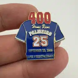 This pin is shaped like a baseball player jersey and commemorates Rafael Palmeiro’s 400 home run milestone with the Texas Rangers. The design features the name Palmeiro across the back, with the number 400 at the top and the words home runs below, along with his jersey number 25 incorporated into the layout.