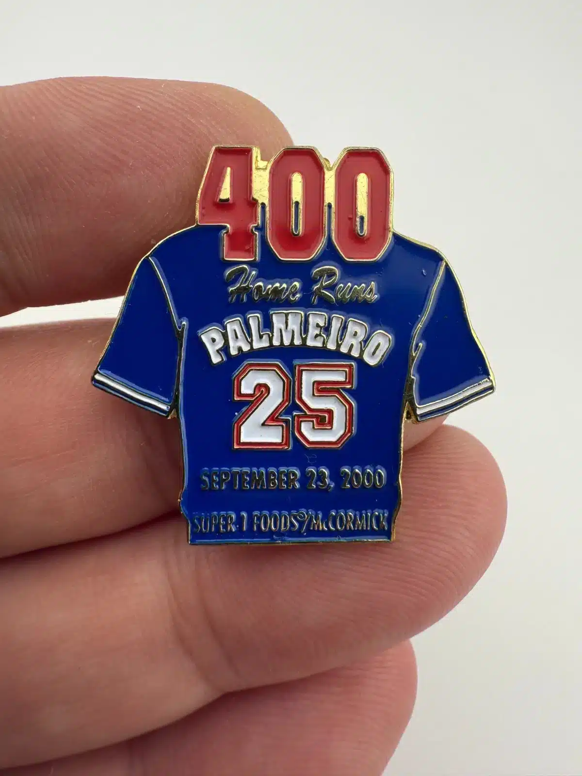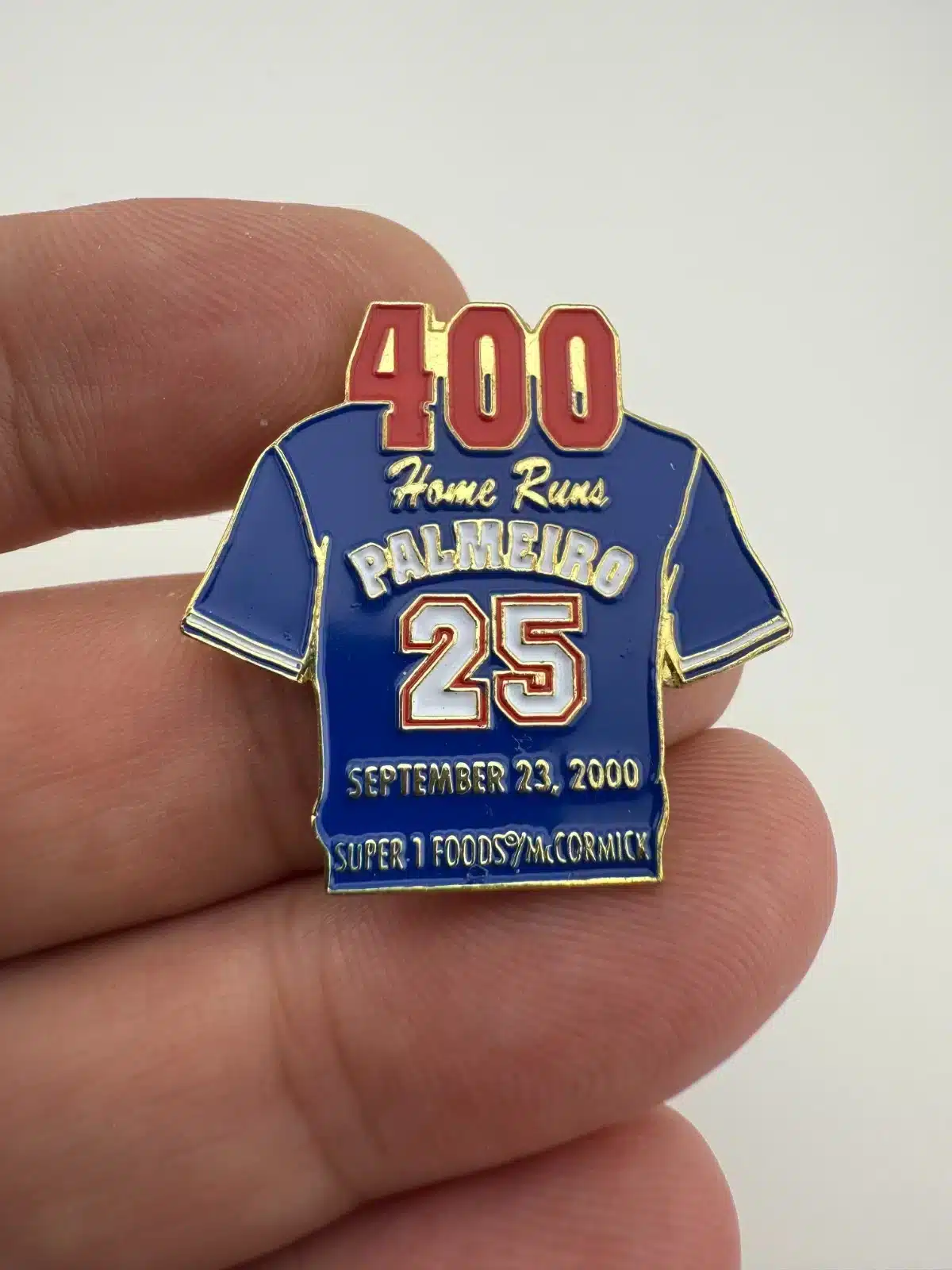 This pin is shaped like a baseball player jersey and commemorates Rafael Palmeiro’s 400 home run milestone with the Texas Rangers. The design features the name Palmeiro across the back, with the number 400 at the top and the words home runs below, along with his jersey number 25 incorporated into the layout.