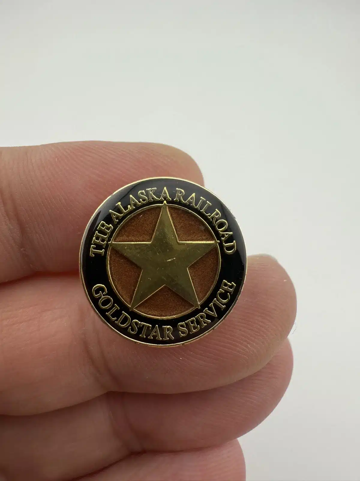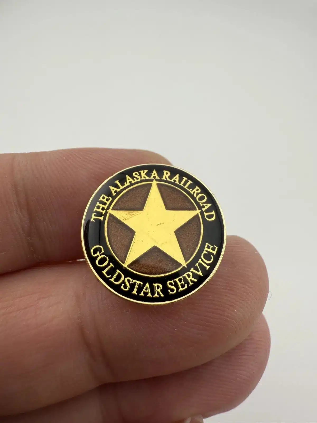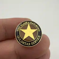 This lapel pin features the Alaska Railroad’s GoldStar Service logo, celebrating premium rail travel in Alaska.