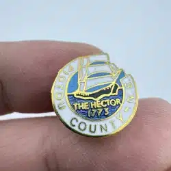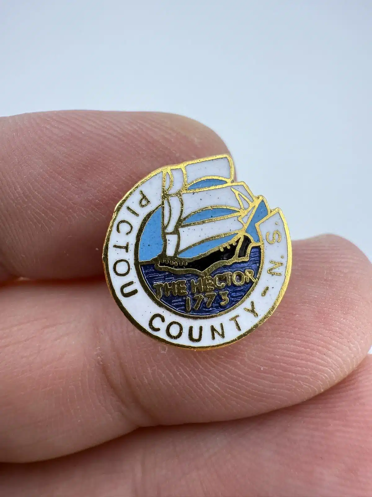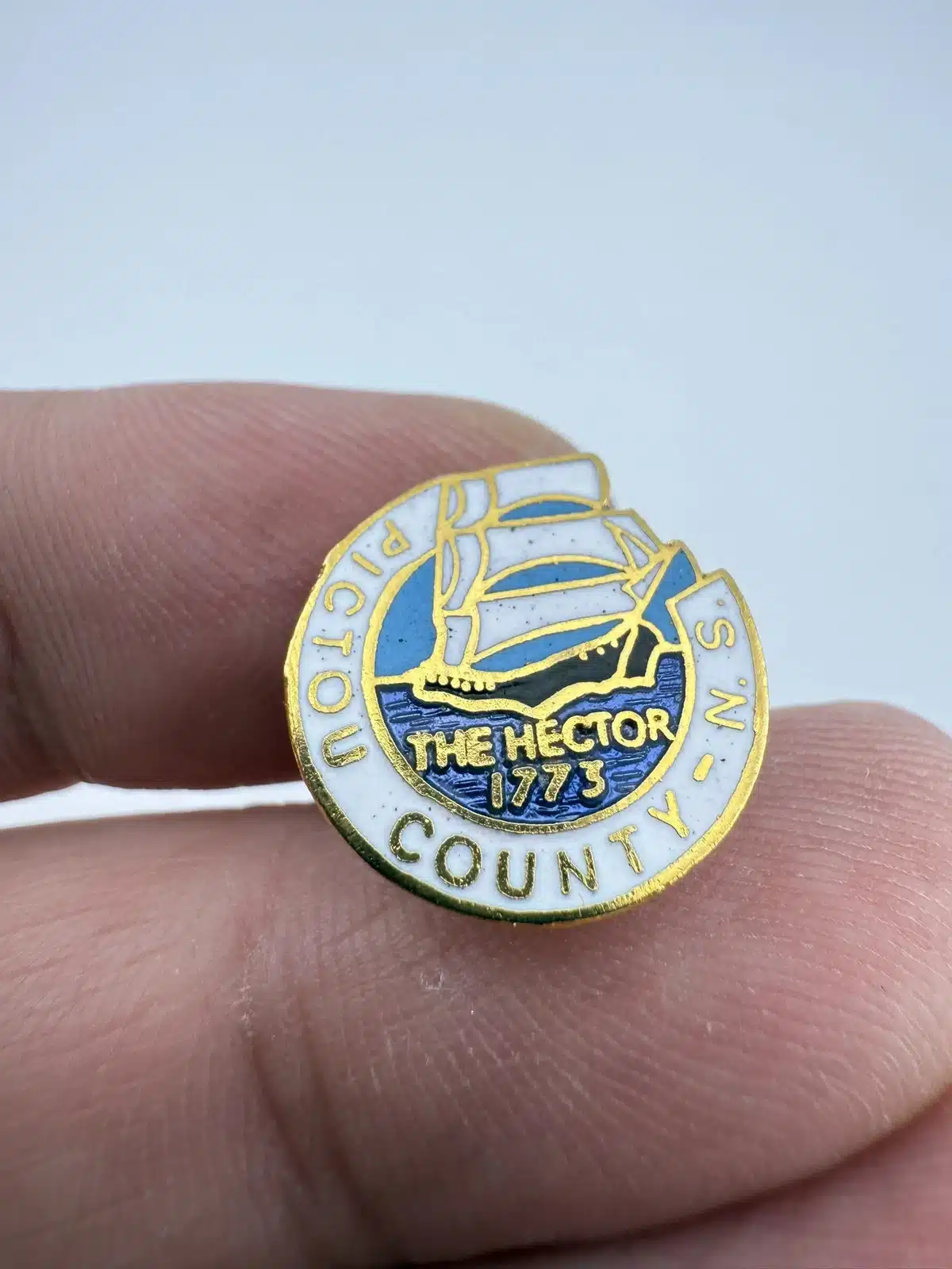 This pin commemorates the Hector ship, which played a significant role in bringing Scottish immigrants to Pictou County, Nova Scotia, in 1773.