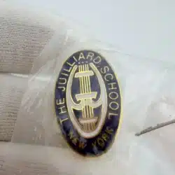 This emblem pin features a striking design in purple and white enamel, set against a gold-tone background, showcasing the prestigious Juilliard School’s commitment to excellence in the performing arts. The pin serves as a symbol of the school’s rich history and its influential role in shaping the careers of countless artists since its 1905 founding in New York by Frank Damrosch.