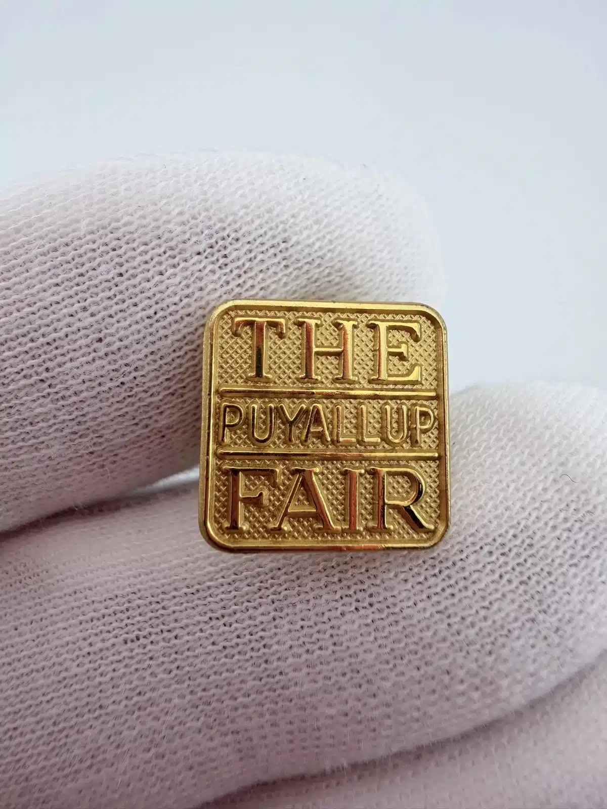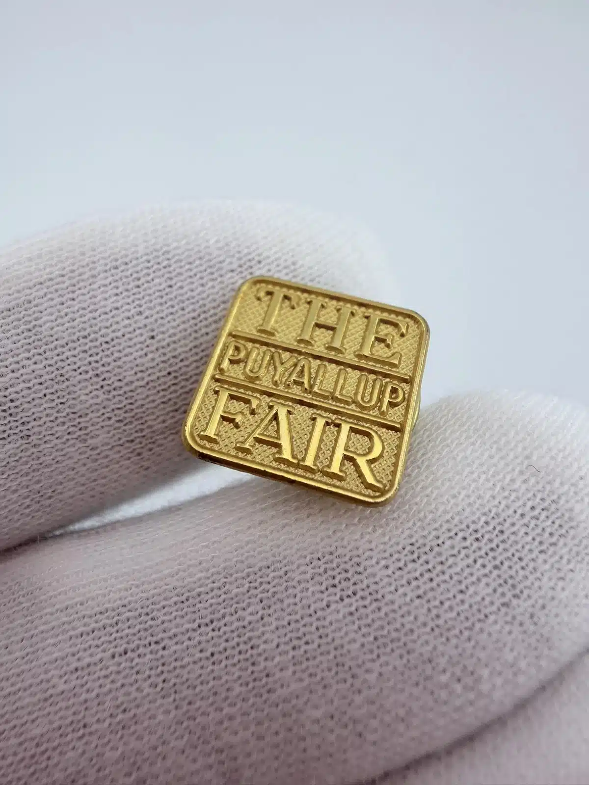 Measuring approximately 1/2 inch by 1/2 inch, the pin has a compact square profile that makes it subtle, easy to wear, and well-suited for display alongside other fair memorabilia.