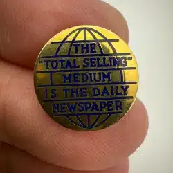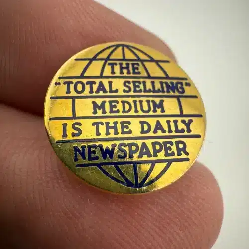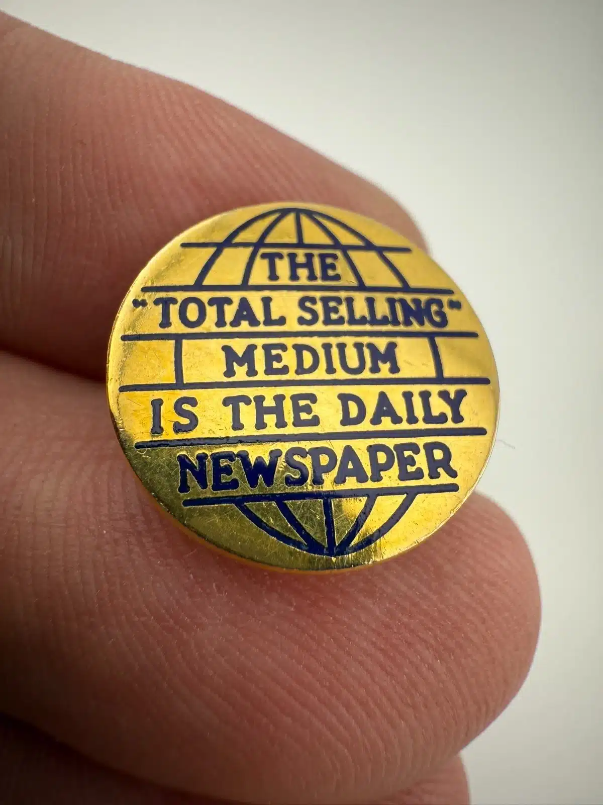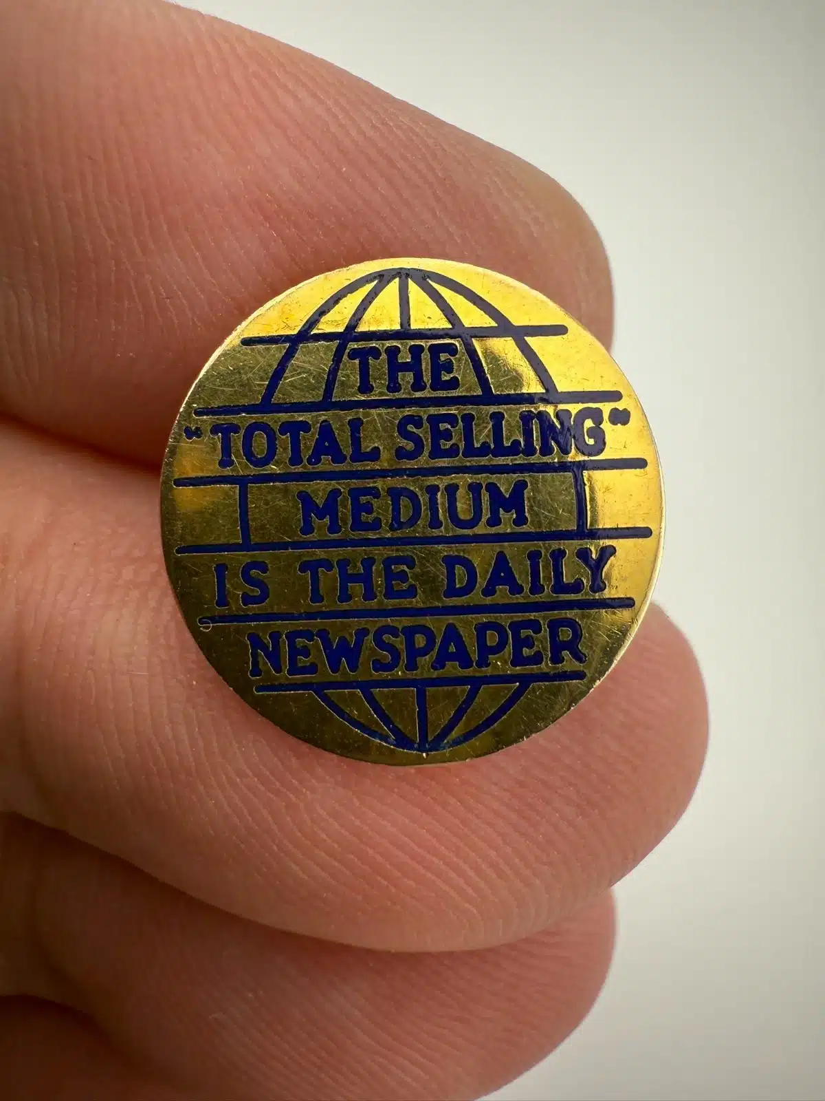 This lapel pin features the phrase ‘The Total Selling Medium Is The Daily Newspaper’ which is no longer true thanks to the growth of the internet.