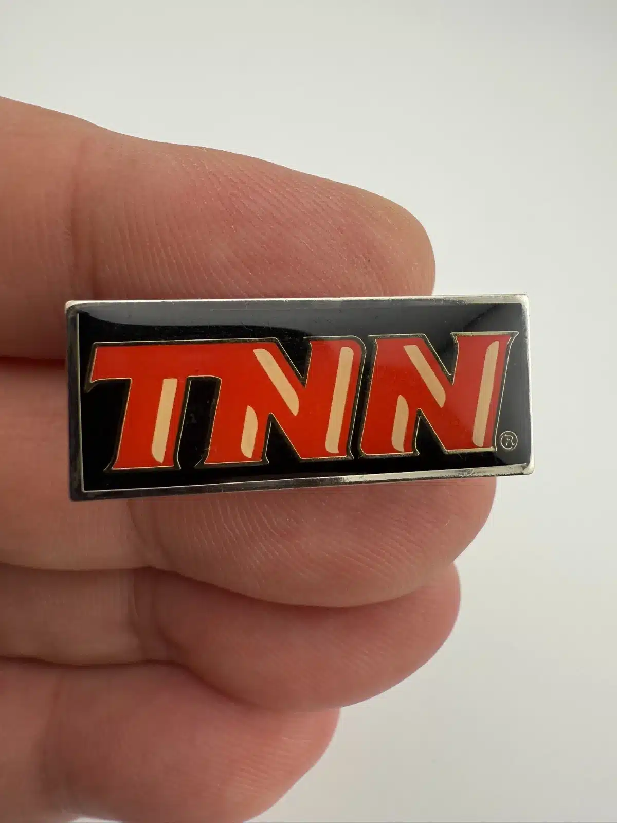 Featuring a silver tone finish with a black background, this rectangular pin displays the bold red letters TNN across the front in a clean logo-based design. The strong color contrast gives it a simple, recognizable broadcast branding look.