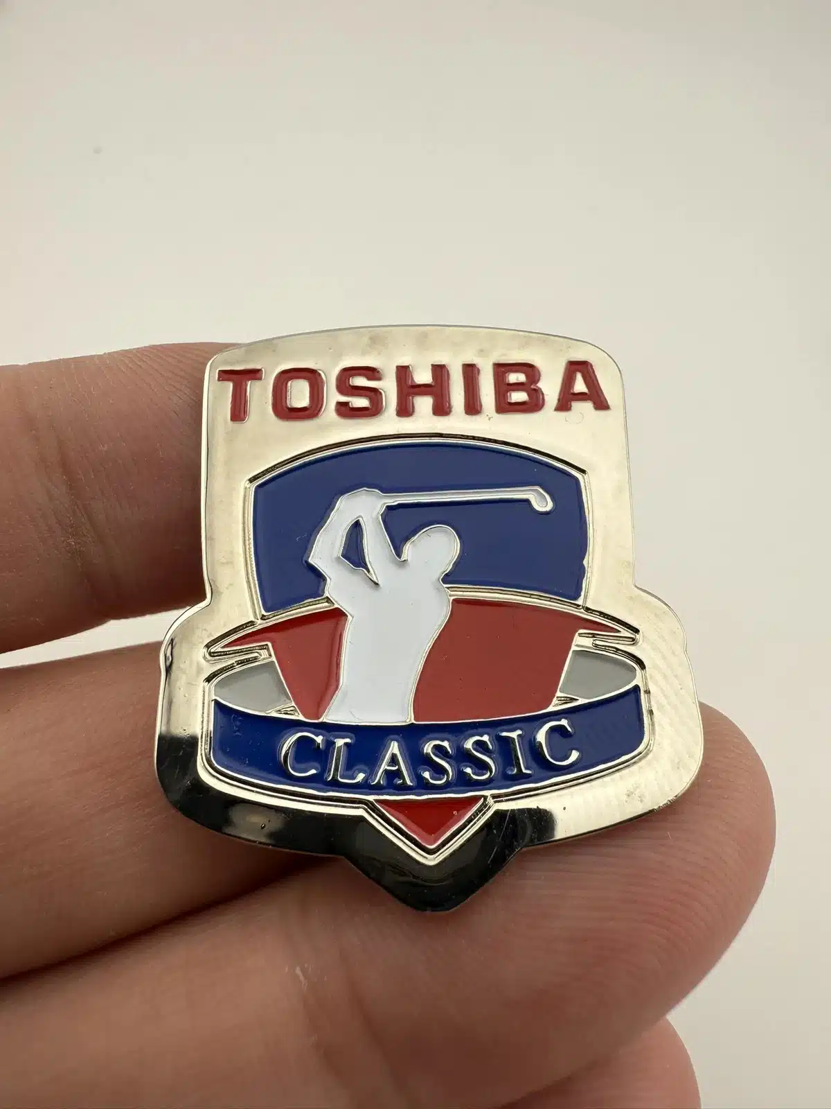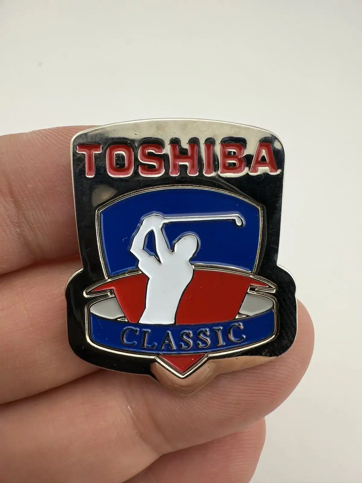 This Toshiba Classic Golf Pin features a vibrant design in red, white, and blue enamel.