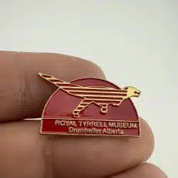 This pin features a Tyrannosaurus Rex running design and is associated with the Tyrrell Museum of Paleontology in Drumheller, Alberta, Canada.