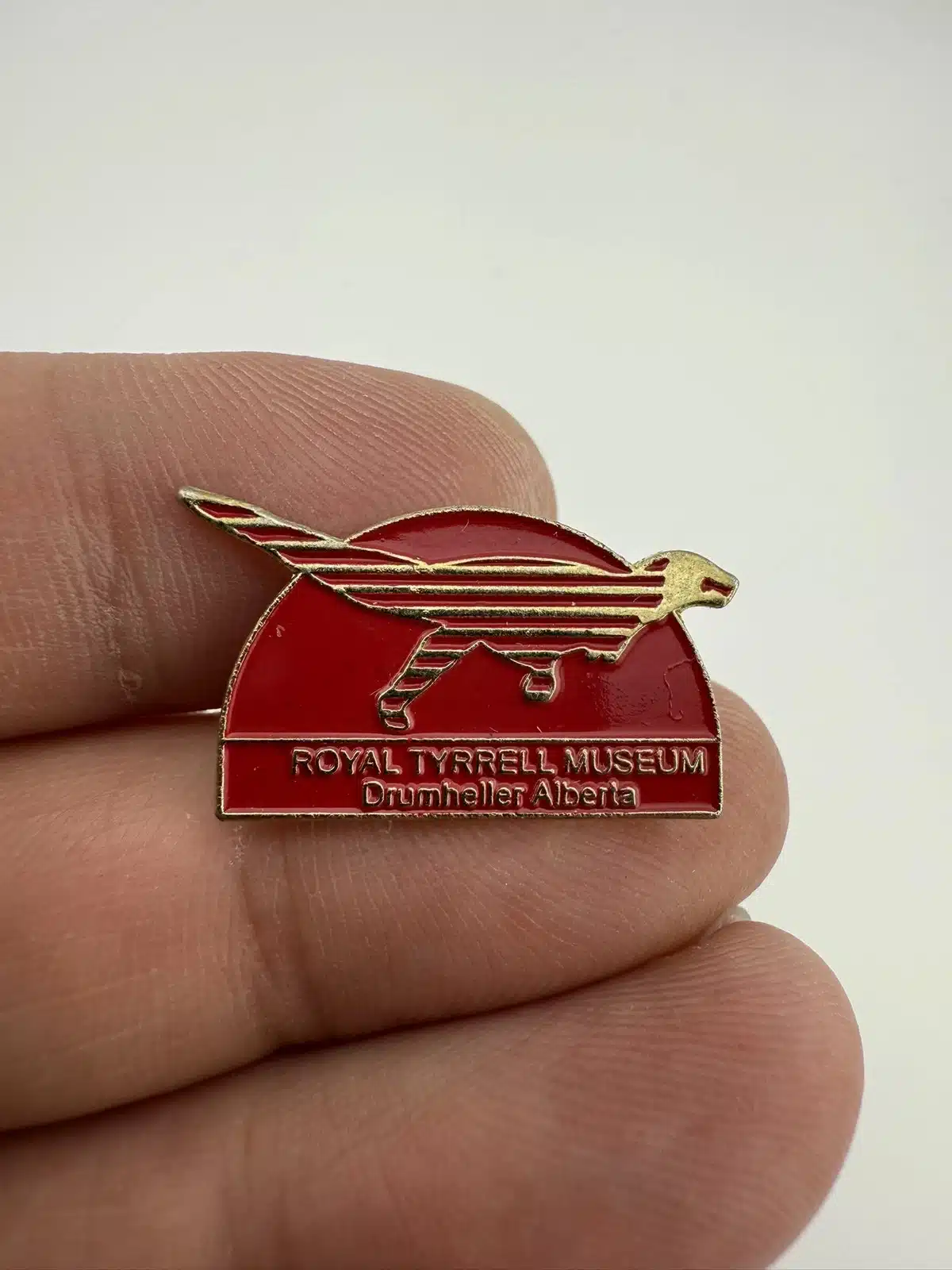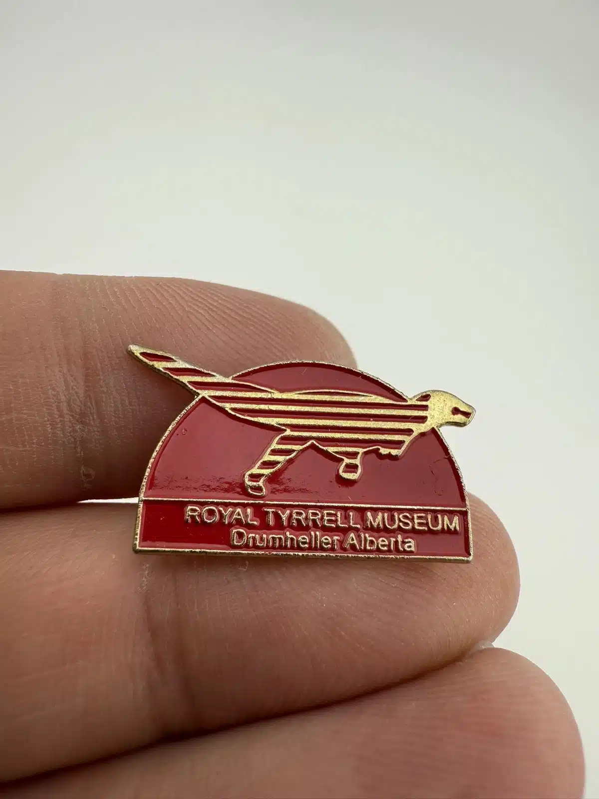 This pin features a Tyrannosaurus Rex running design and is associated with the Tyrrell Museum of Paleontology in Drumheller, Alberta, Canada.