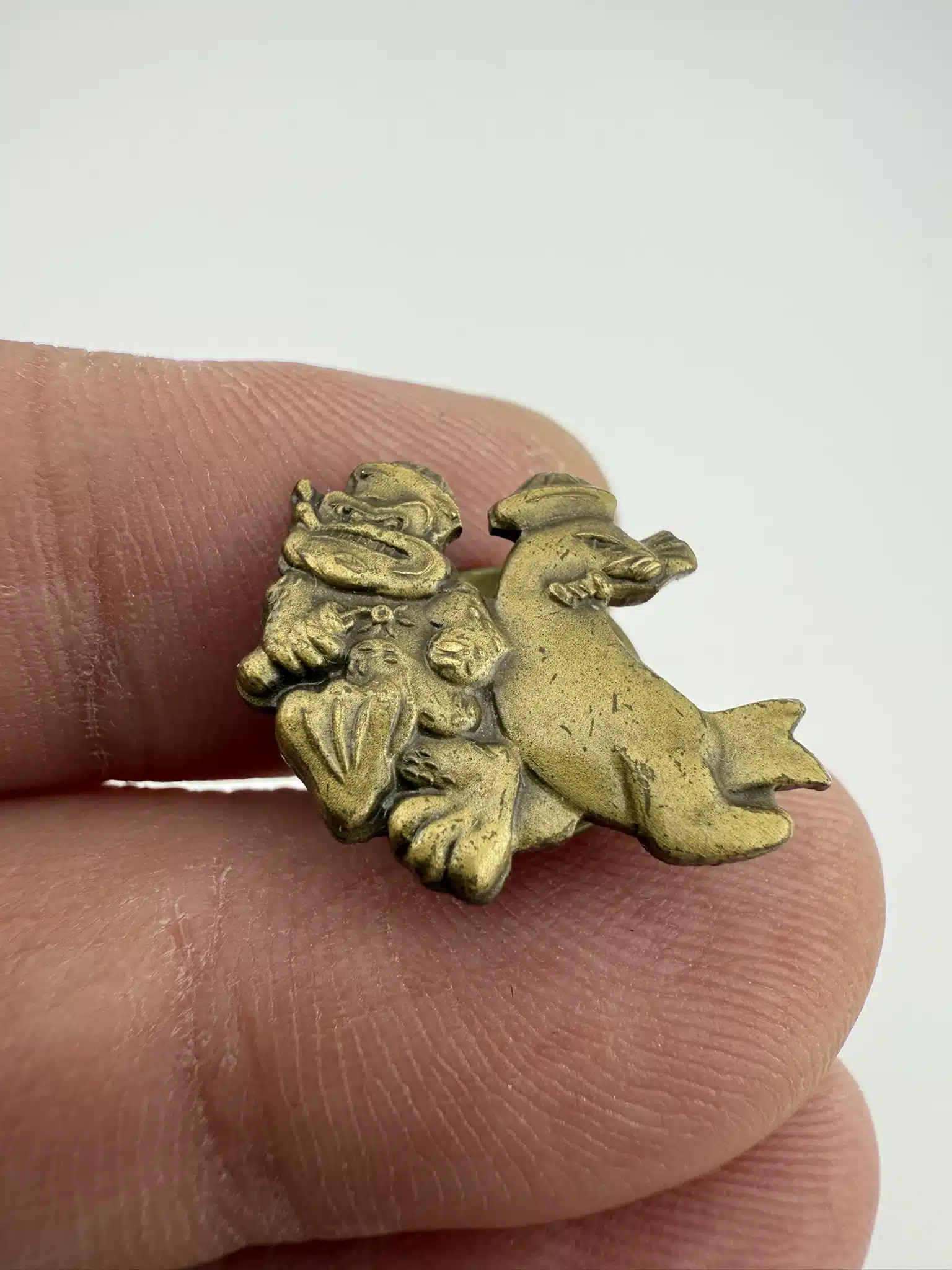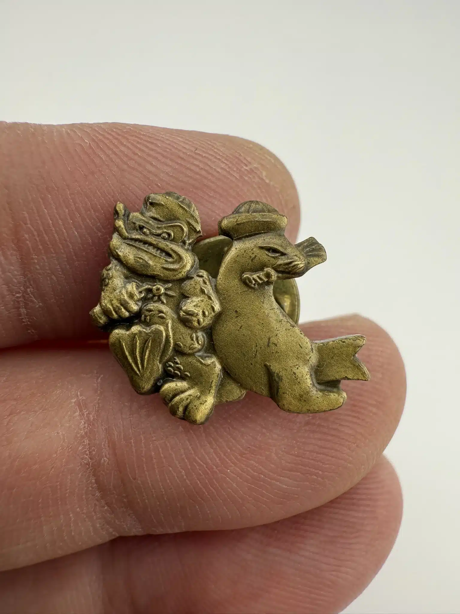 This UDT Frogmen lapel pin features a detailed scene showing a frogman in action alongside a seal. The frogman is depicted carrying a lit stick of dynamite, while the seal holds a sword in its mouth, symbolizing covert maritime combat and demolition work. Established during World War II, the UDT played a critical role in reconnaissance and beach-clearing operations, making this pin a meaningful piece of US Navy military history.