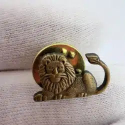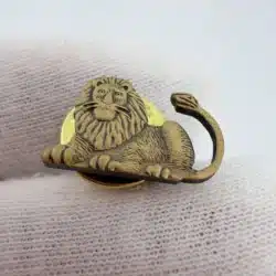 This unique lion figural lapel hat pin features a striking depiction of the lion with a distinctive facial expression and its tail raised, showcasing a sense of vitality and character. The bronze tone adds a classic touch, making it a notable piece for collectors interested in animal-themed memorabilia.