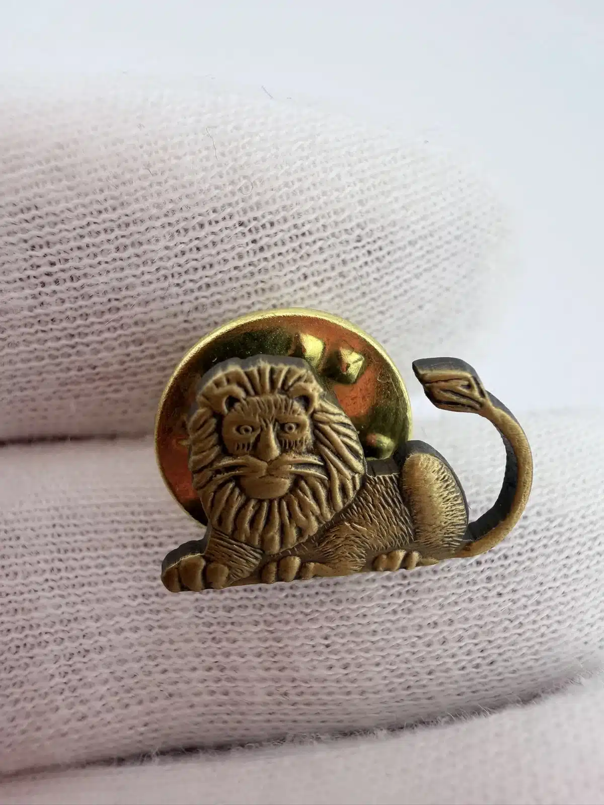 This unique lion figural lapel hat pin features a striking depiction of the lion with a distinctive facial expression and its tail raised, showcasing a sense of vitality and character. The bronze tone adds a classic touch, making it a notable piece for collectors interested in animal-themed memorabilia.
