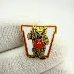 This unique Wisconsin Badgers pin features a bold white letter ‘W’ outlined in red along with their Badger mascot in a one-piece athletic uniform, representing the spirit of competition in various sports, potentially wrestling.