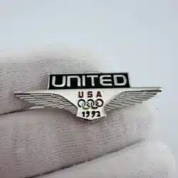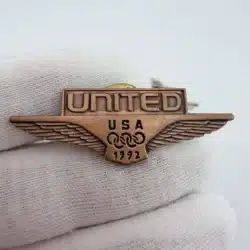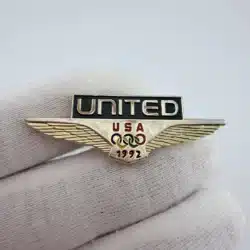 This set of United Airlines wing pins commemorates the 1992 Olympics, featuring bronze, silver, and gold-tone finishes that represent the medals awarded during the games. Each pin showcases the iconic Olympic rings with USA above and 1992 below, symbolizing unity and athletic excellence, making them a notable piece of Olympic memorabilia.