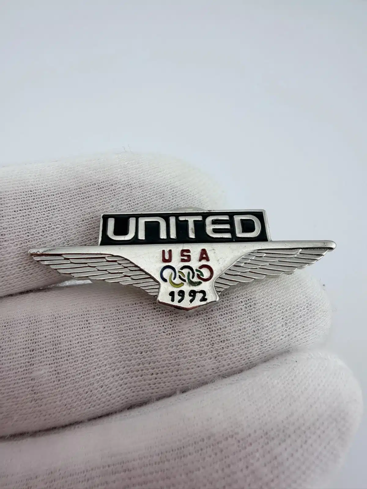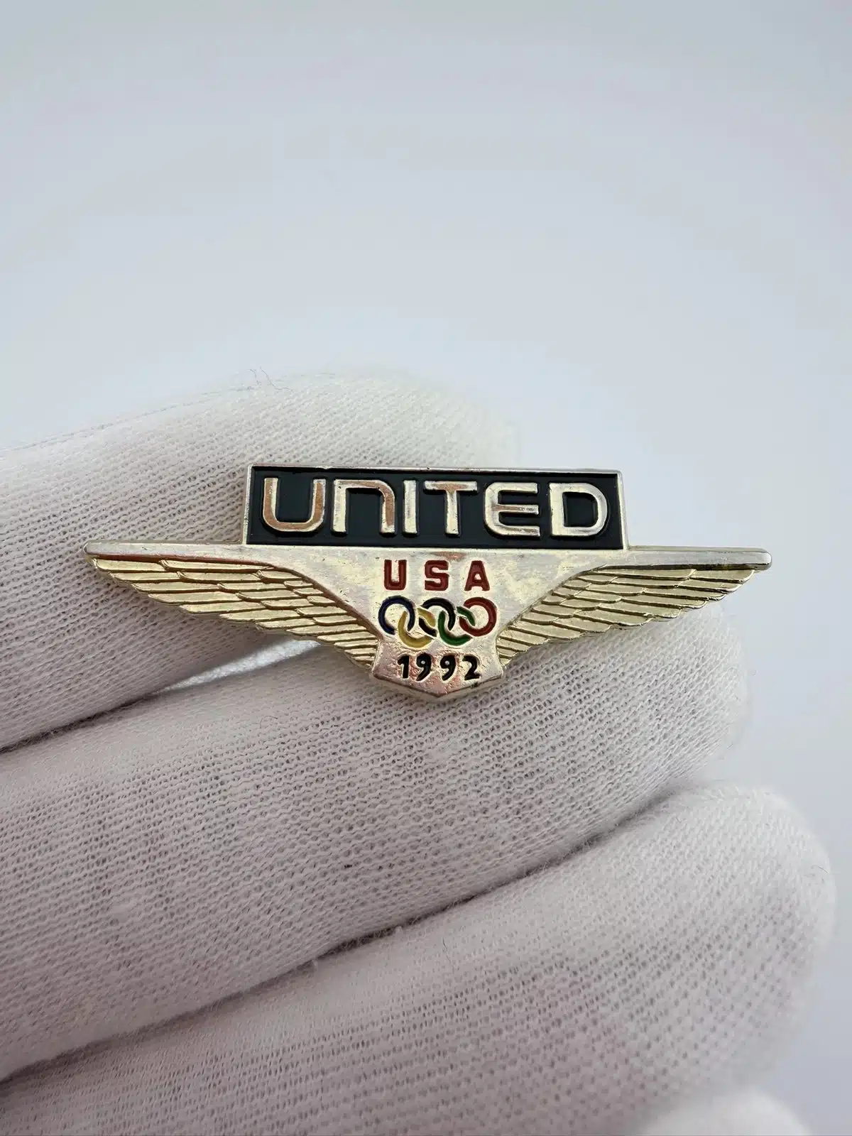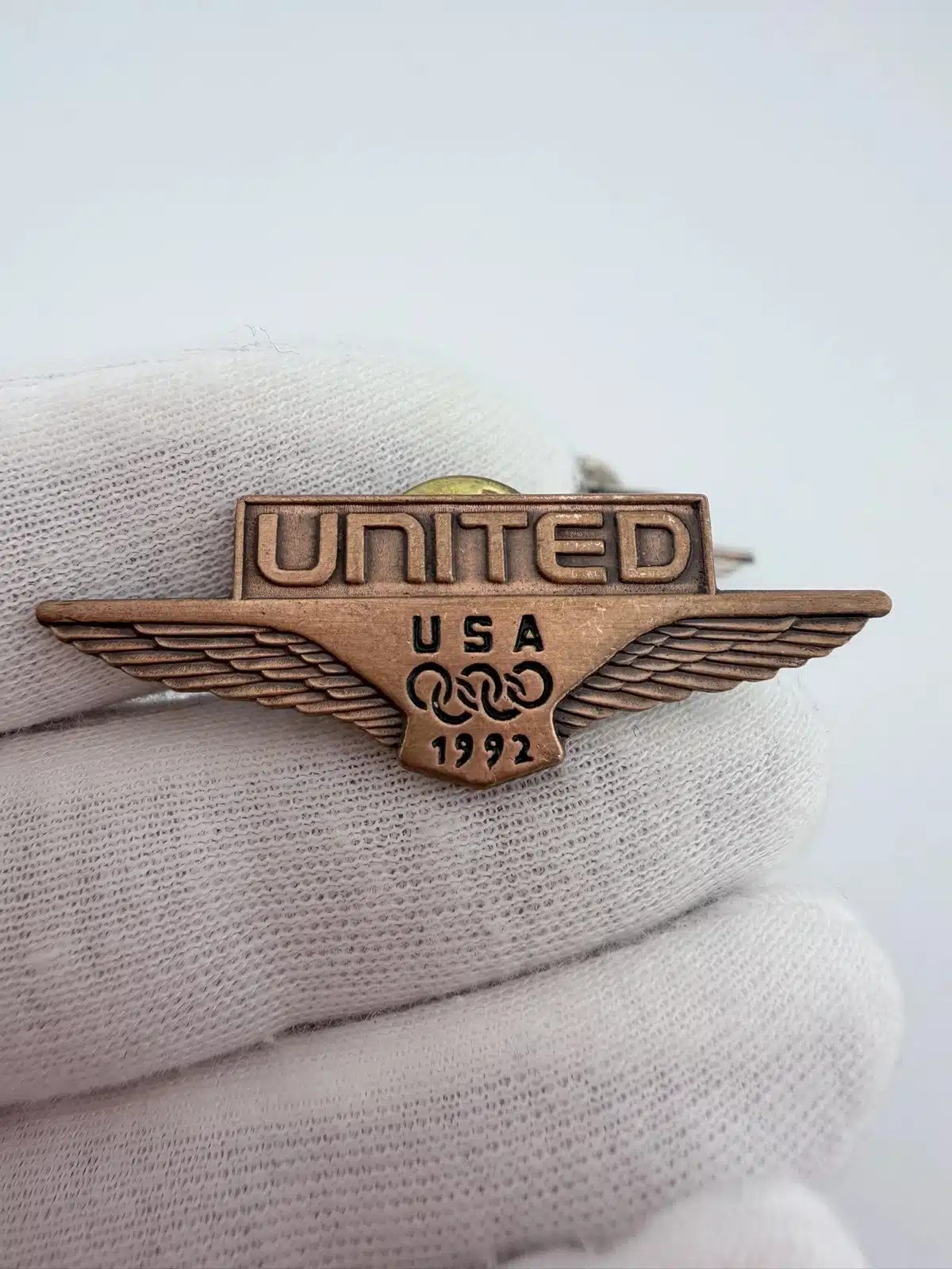 This set of United Airlines wing pins commemorates the 1992 Olympics, featuring bronze, silver, and gold-tone finishes that represent the medals awarded during the games. Each pin showcases the iconic Olympic rings with USA above and 1992 below, symbolizing unity and athletic excellence, making them a notable piece of Olympic memorabilia.