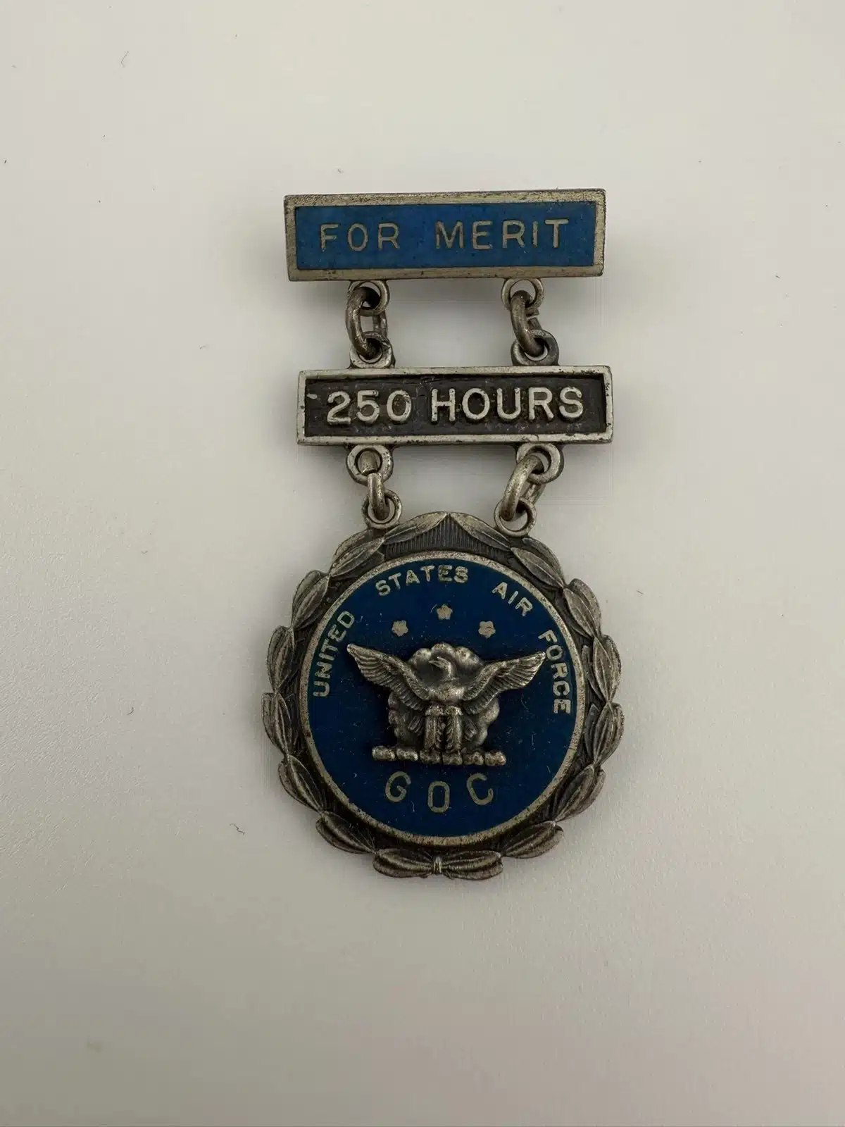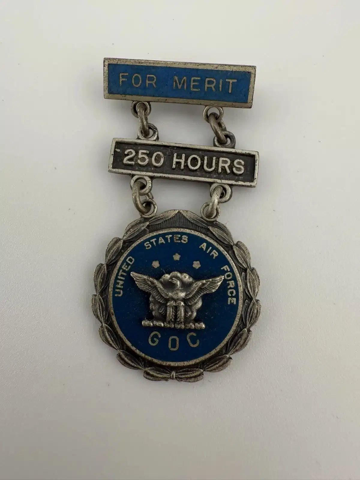 The United States Air Force GOC Ground Observer Corps For Merit Pin recognizes individuals who have dedicated 250 hours of service.