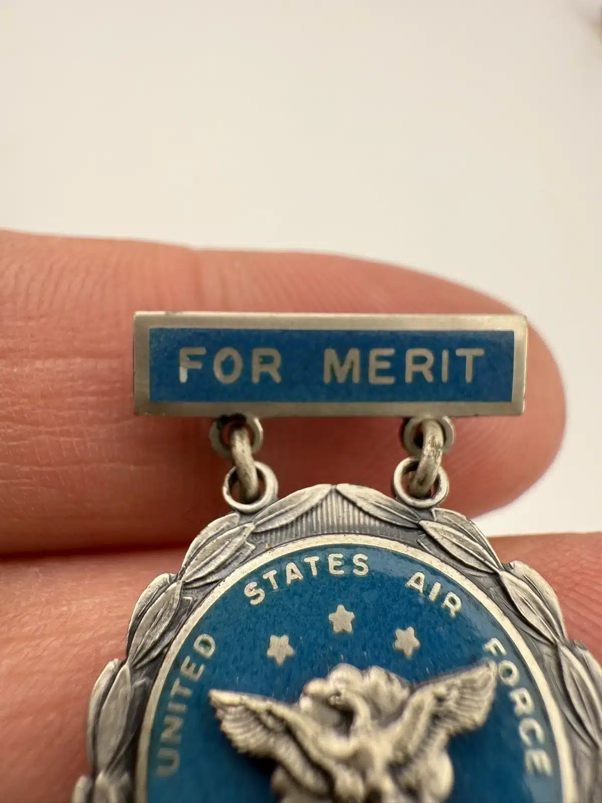 This multi-part pin features a horizontal top bar reading For Merit, with a suspended circular medallion below that reads United States Air Force GOC. The lower portion displays a silver tone design with a laurel wreath, blue enamel center, and an eagle with wings spread wide, creating a detailed military award style piece.