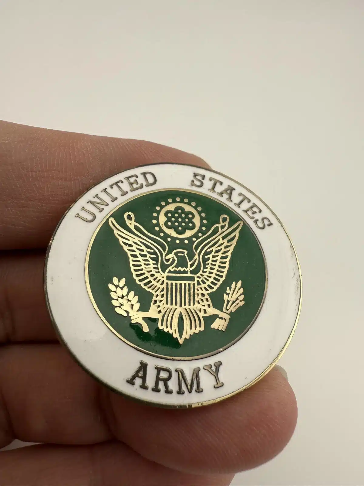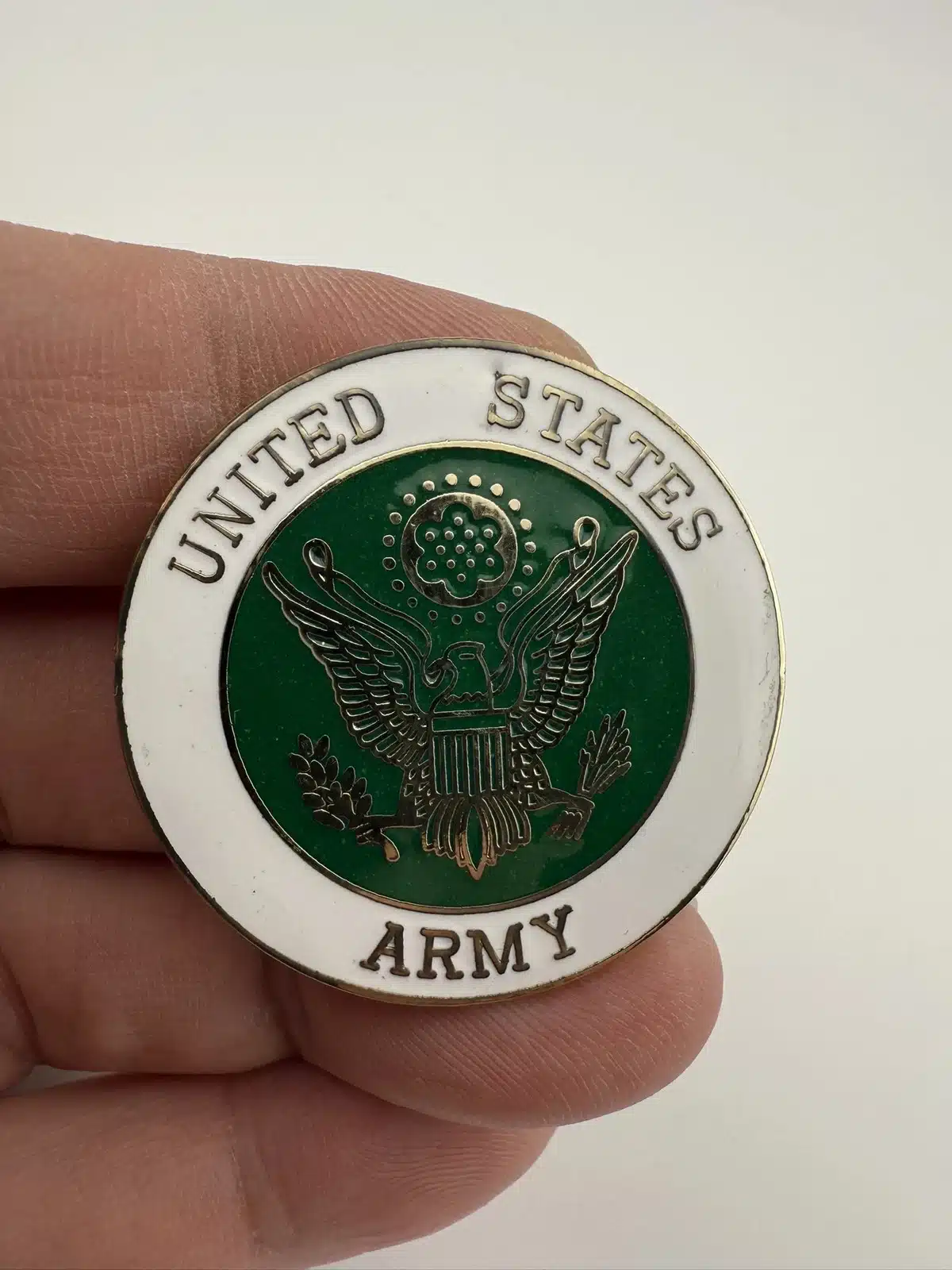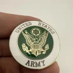 This 1.5 inch pin features the seal of the United States Army at its center, surrounded by green and white enamel. The clean, balanced design reflects the Armys long-standing commitment to excellence, service, and tradition.
