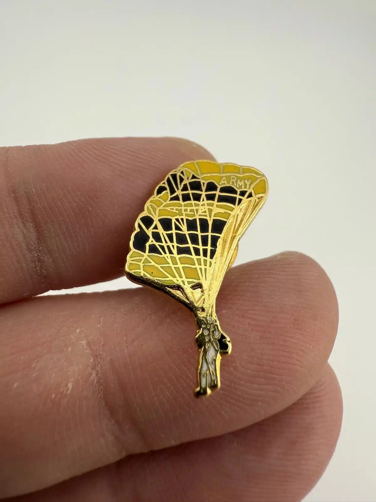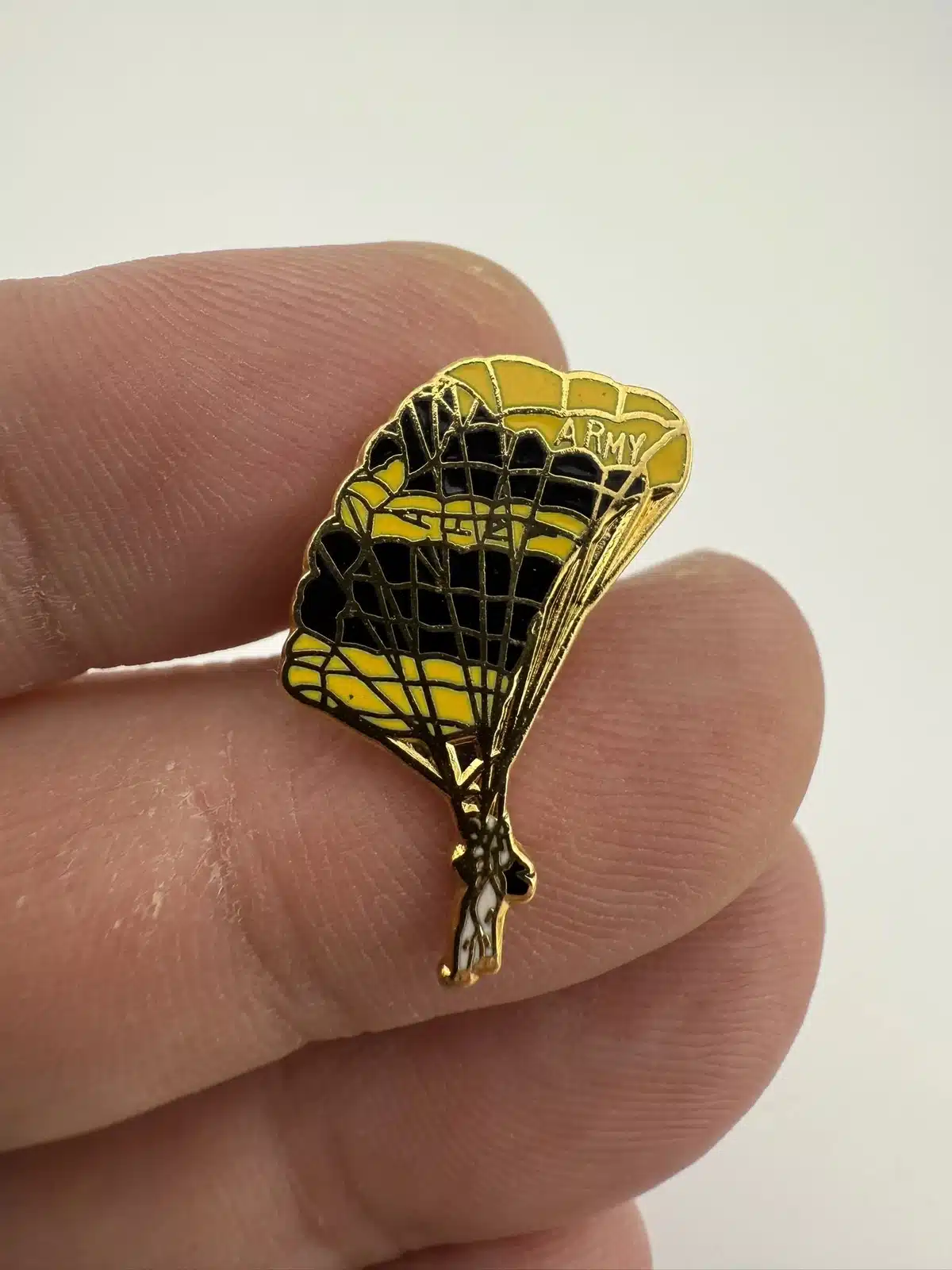 This tie tack pin features a detailed representation of an United States Army Parachutist, showcasing a gliding solider under a yellow and black parachute. The pin serves as a tribute to the airborne forces of the U.S. Army, symbolizing the skill and bravery of those who serve.