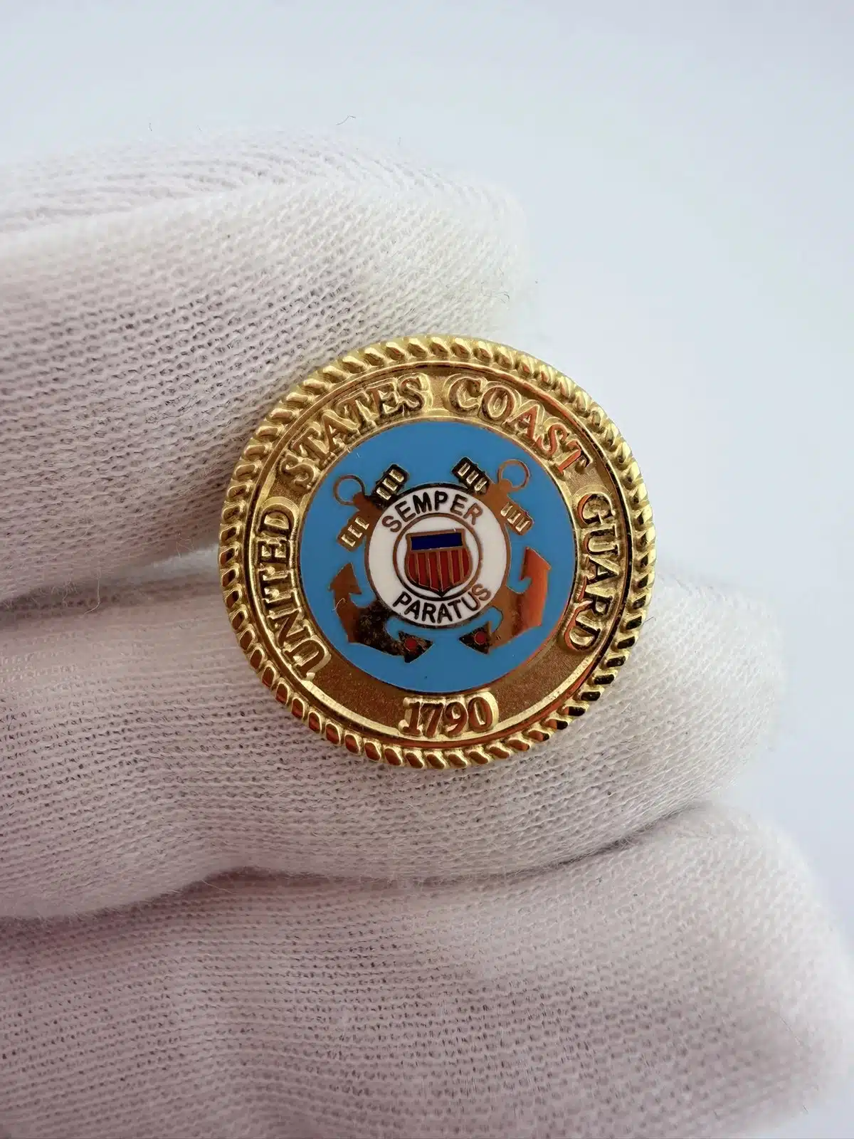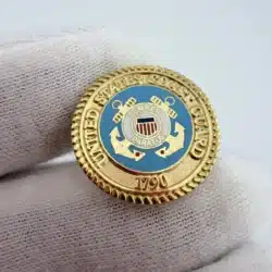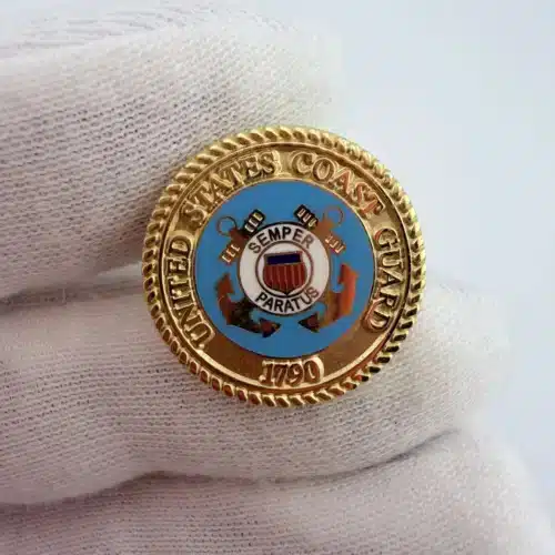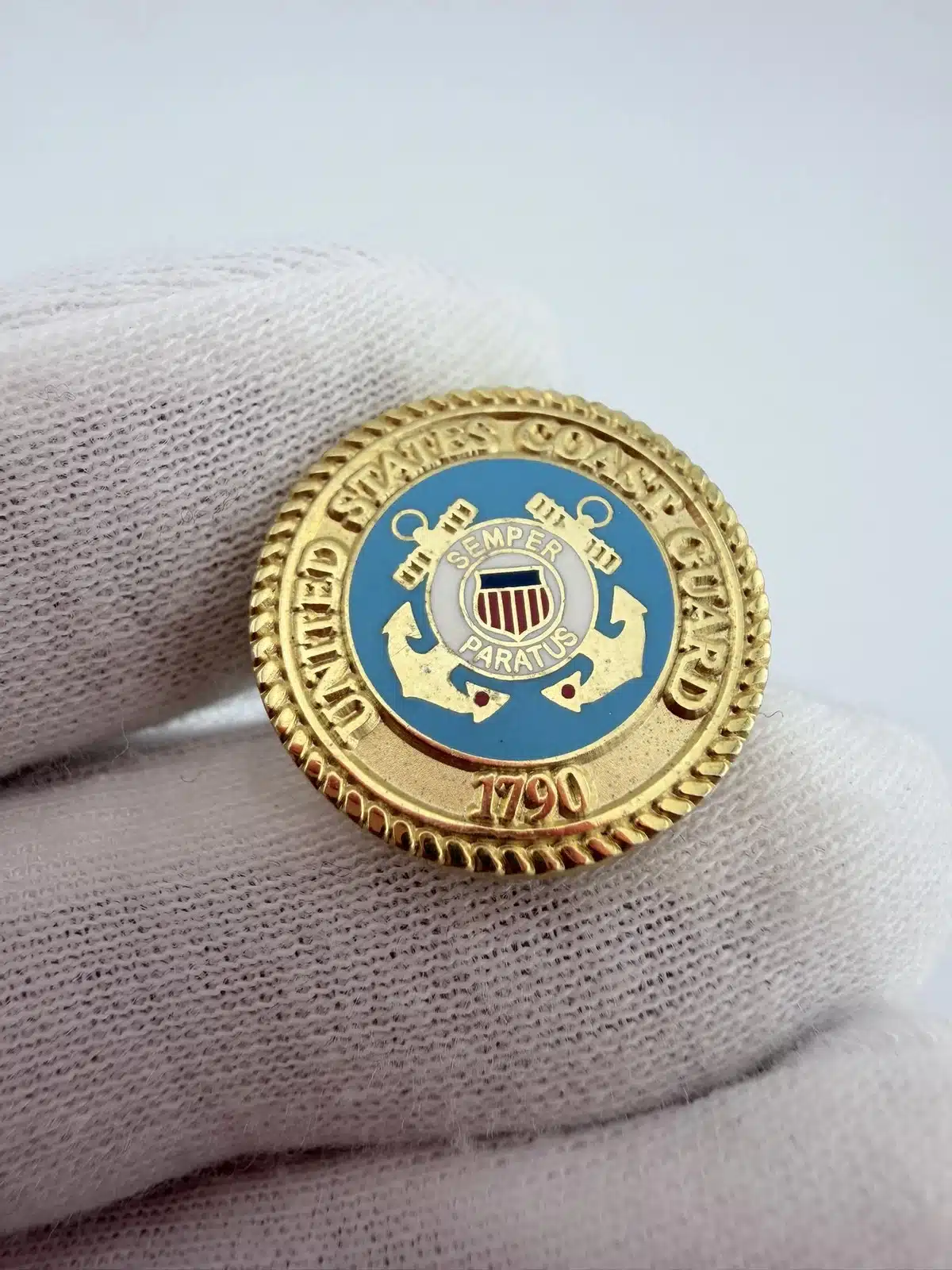Around the inner upper portion of the pin it reads “United States Coast Guard,” with “1790” displayed at the bottom, referencing the year of the service’s founding.