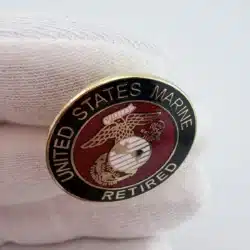 This United States Marine Retired pin features a gold tone circular design with “UNITED STATES MARINE RETIRED” displayed around the outer edge over black enamel. The strong contrast between the gold lettering and dark background gives the piece a bold, distinguished appearance.