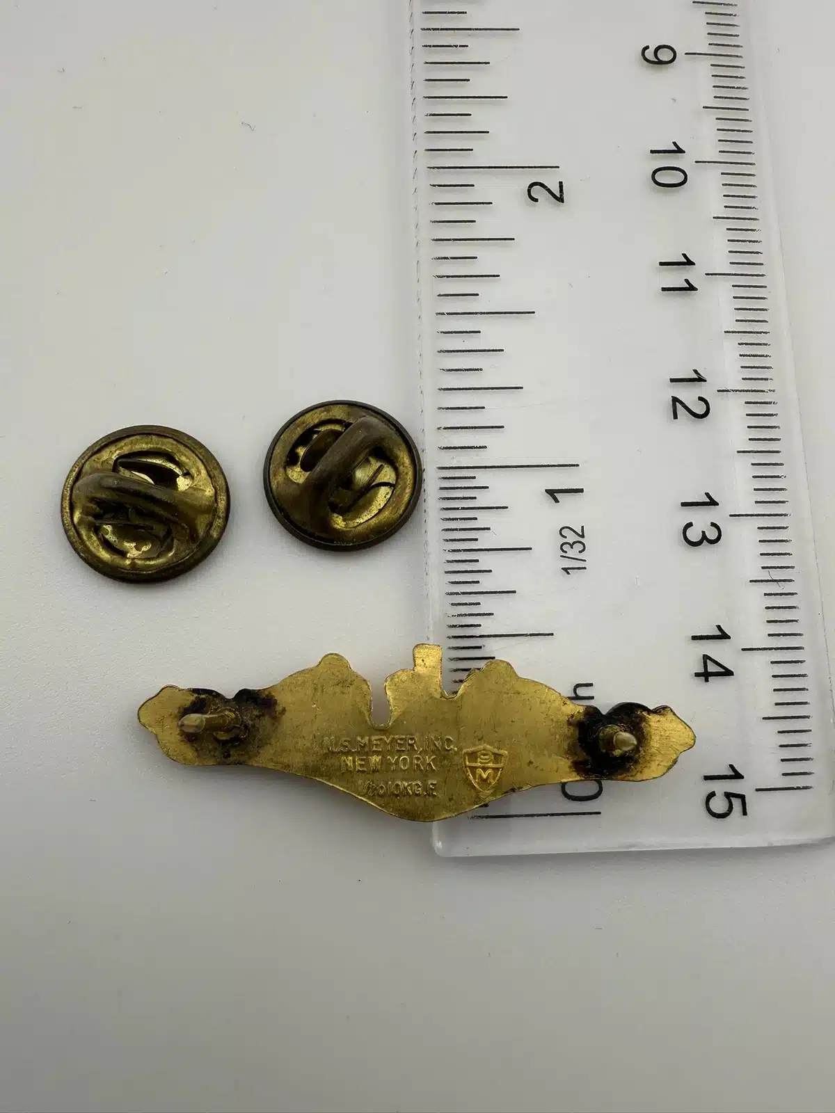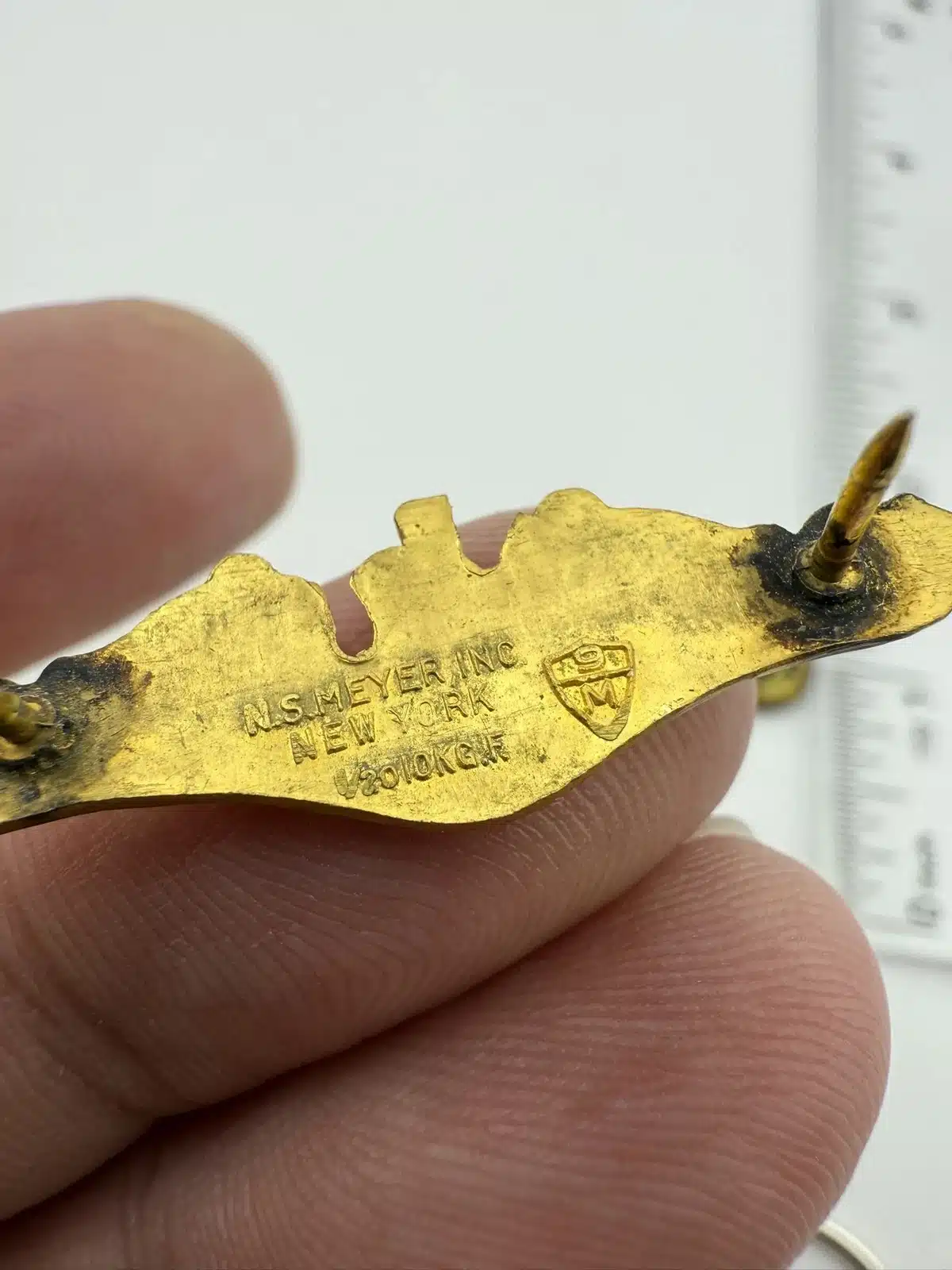 This United States Navy Submarine Warfare Insignia badge was produced by N.S. Meyer, Inc. of New York and is marked 1/20 10K gold fill with a raised 9M hallmark. The badge measures approximately 1.5 inches wide by 0.5 inches tall and features a dual clasp. Based on the maker and markings, it was likely manufactured between the mid 1950s and mid 1960s.