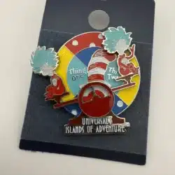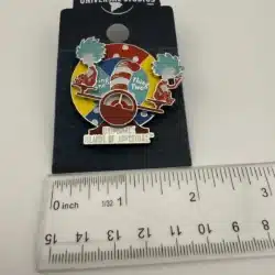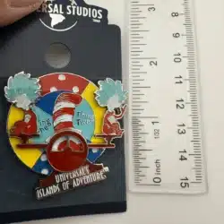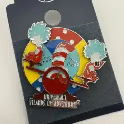 This enamel pin features the iconic characters Thing 1 and Thing 2 from Dr. Seuss’s beloved book “The Cat in the Hat,” known for their playful blue hair and mischievous expressions. The pin captures the whimsical essence of Universal Studios’ Islands of Adventure, celebrating the vibrant world of Seuss Landing.