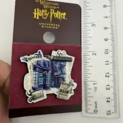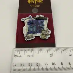 This lapel hat pin features a detailed depiction of Knockturn Alley, the infamous dark wizarding street from the Harry Potter series, showcasing its distinctive architecture and mystical ambiance.
