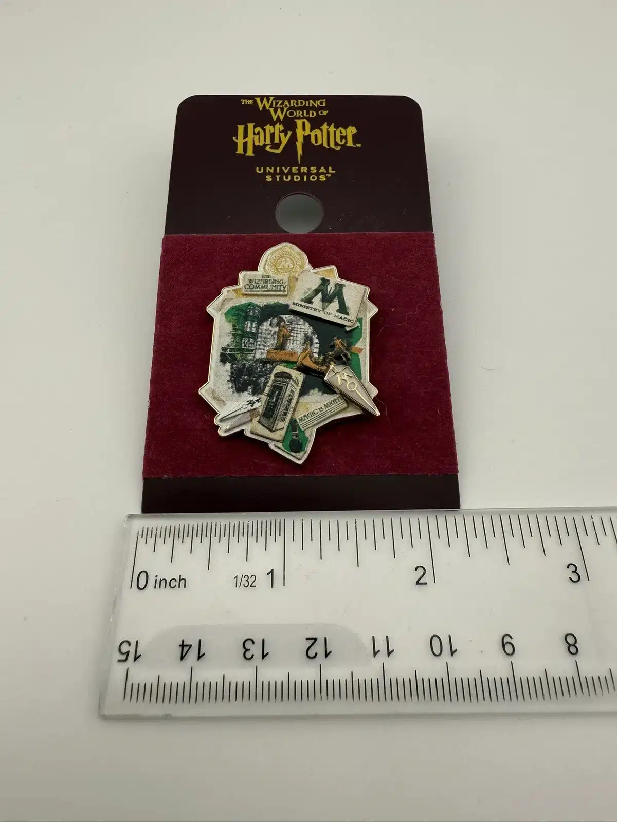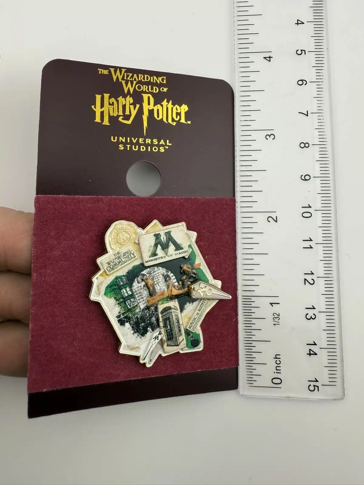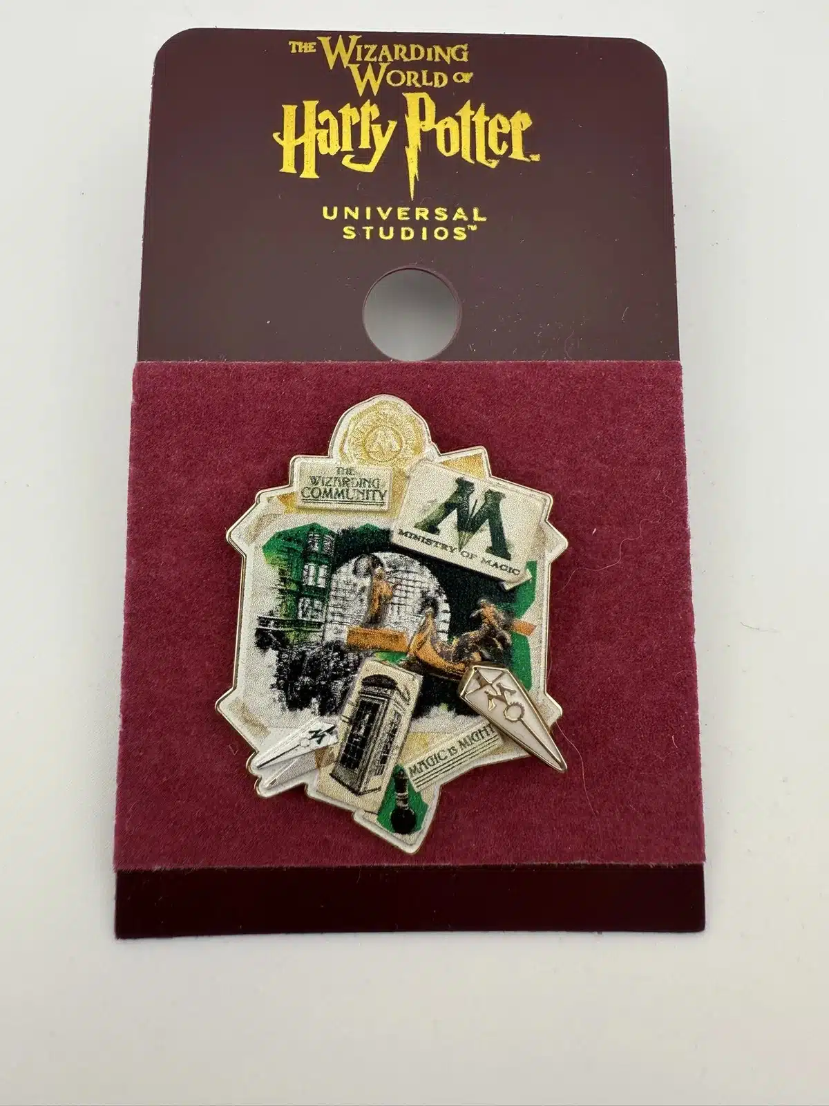 This lapel pin features various scenes and items from the Ministry of Magic as well as the M logo, a symbol of the wizarding world from the Harry Potter series.