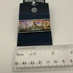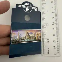 This pin showcases a detailed skyline of Universal Studios Orlando, capturing iconic structures and attractions from the theme park. The vibrant colors and intricate design reflect the excitement and entertainment that the park is known for, making it a standout piece for collectors.