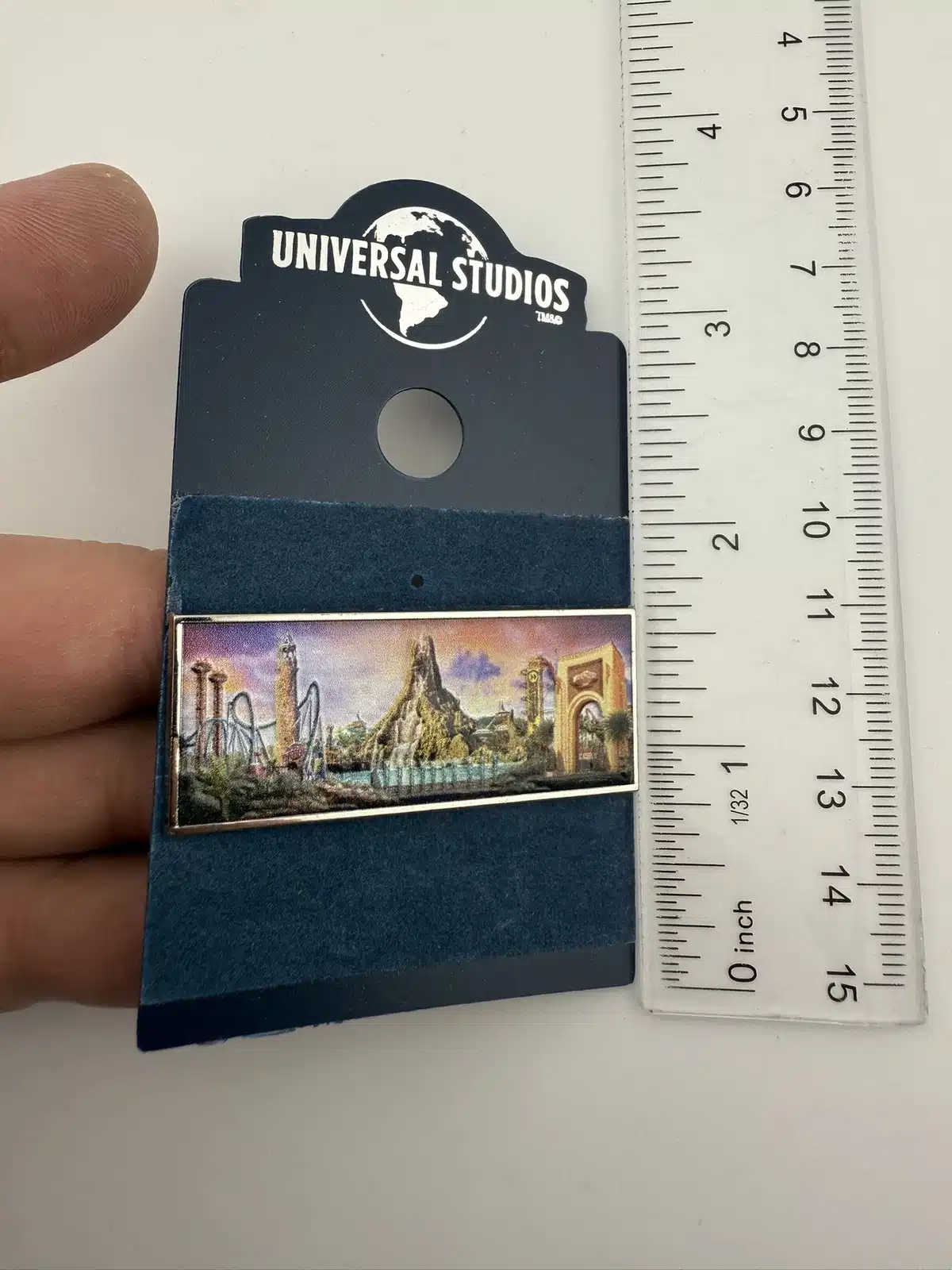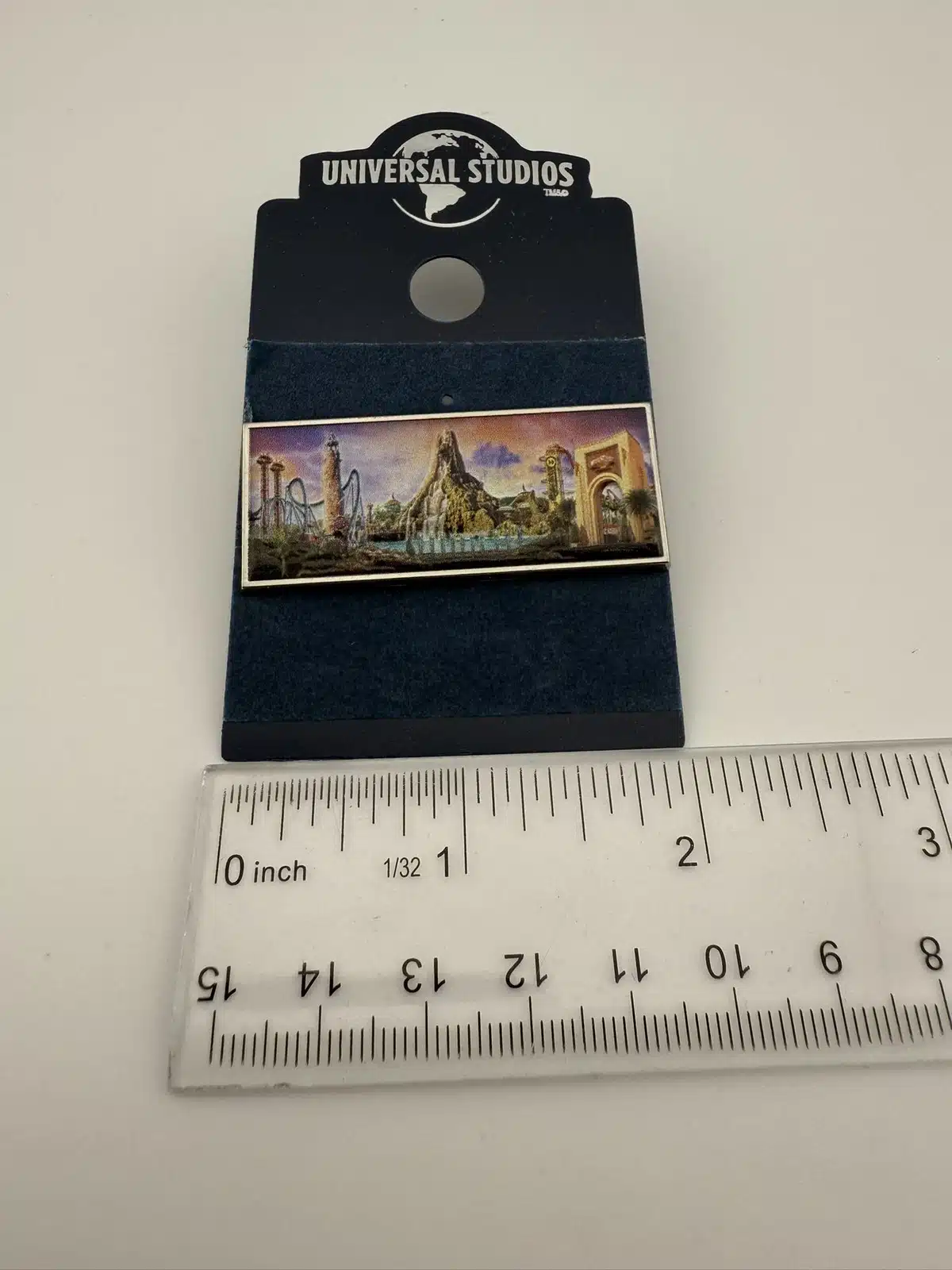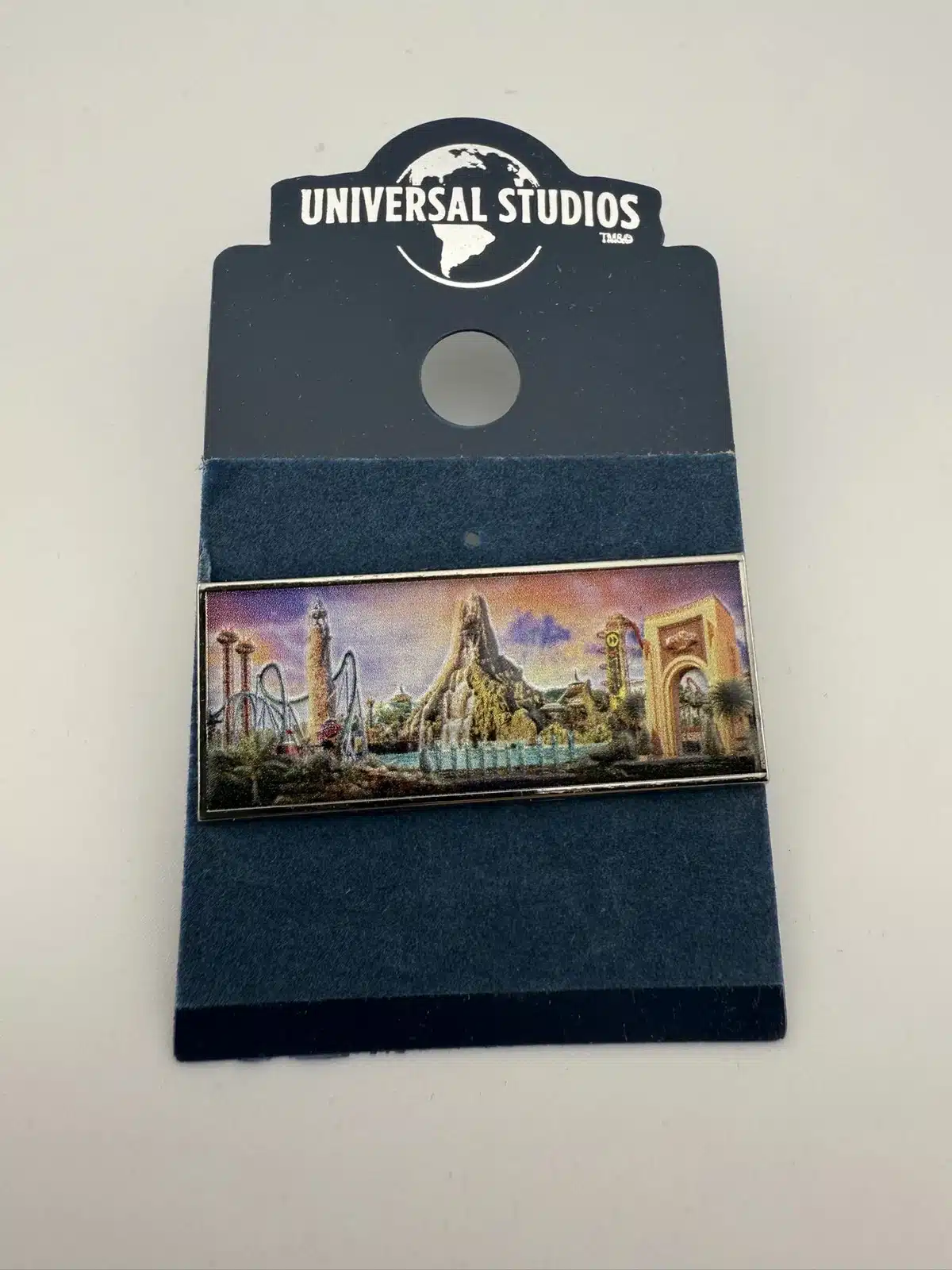 This pin showcases a detailed skyline of Universal Studios Orlando, capturing iconic structures and attractions from the theme park. The vibrant colors and intricate design reflect the excitement and entertainment that the park is known for, making it a standout piece for collectors.