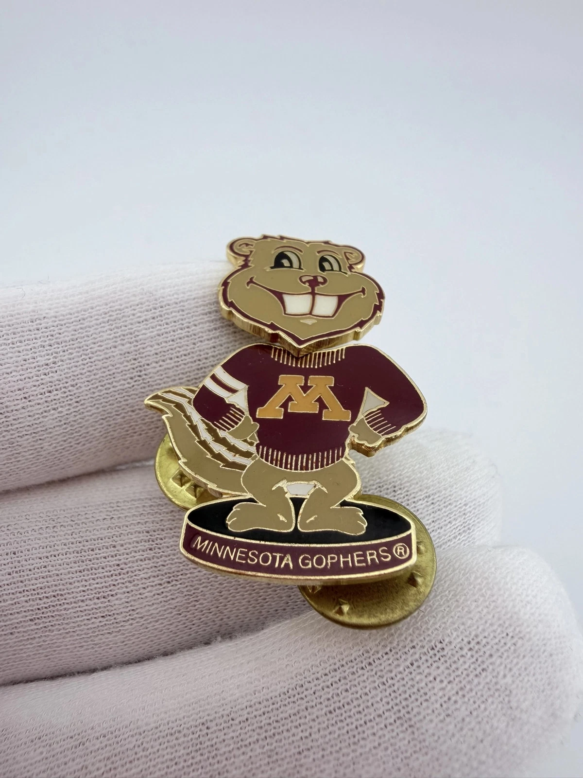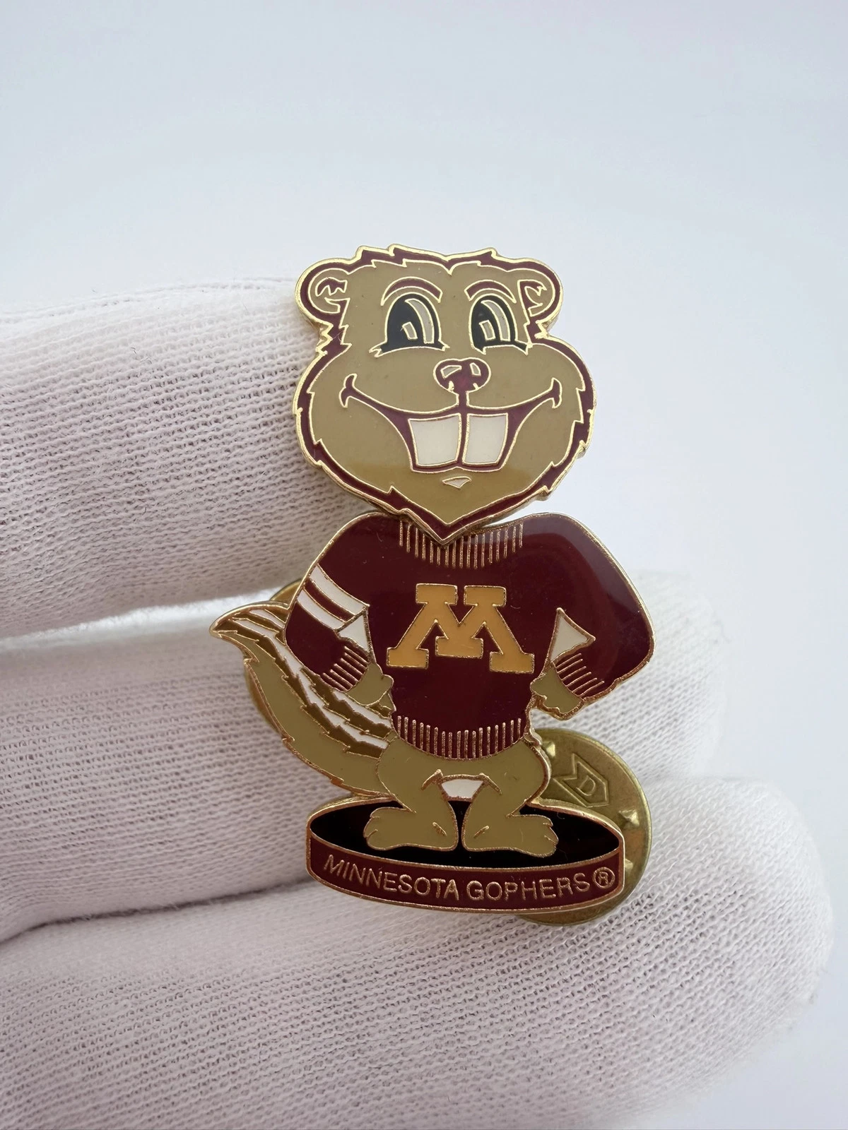The University of Minnesota Golden Gophers represent the university’s athletic teams, with the mascot being a recognizable symbol of school spirit. Bobble style pins like this are novelty items that incorporate movement to add a playful element to traditional lapel pin designs.