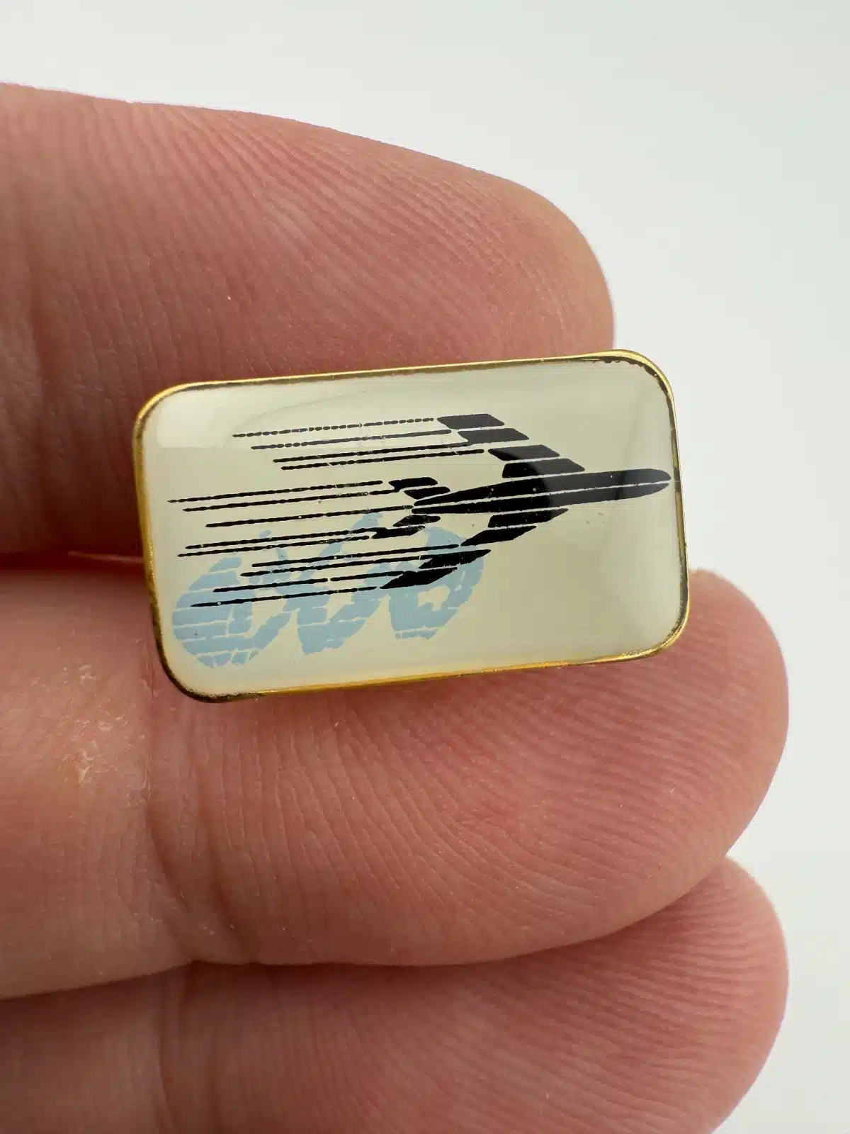 I was unable to figure out what exactly this aviation pin is for, but it features a black airplane along with 3 small blue globes.
